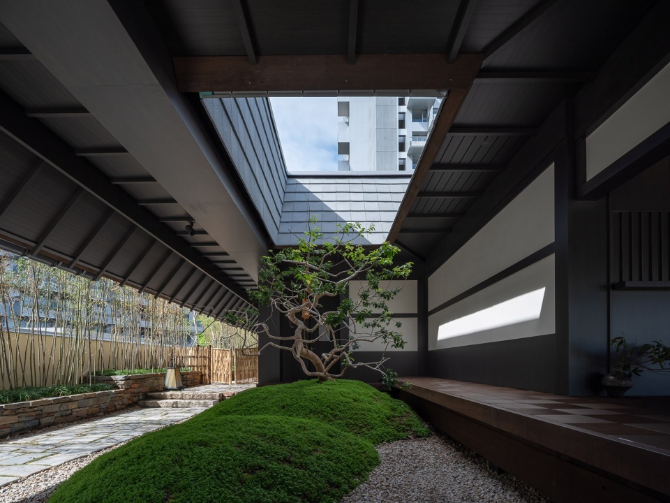 在方寸之间设置一棵造型铁冬青,从树木间隙漏下的光斑,随时间推移在苔庭上演着”移光弄影”的独幕剧。