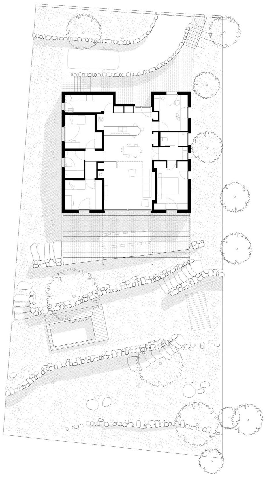 The house is located on a plot organized into a series of existing cross terraces, oriented towards the spectacular views of the valley. This layout allows the outdoor program to be efficiently placed on the land. The widest terrace accommodates the house, while the others are designated for various uses such as the orchard, pool, terrace, or access and car park.