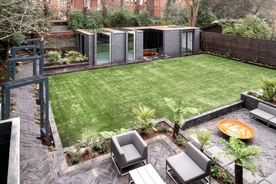 对于屋主而言,户外空间与花园至关重要。为此,特别设计了一片宽敞的露台,包含户外厨房、餐区、带睡莲池的下沉式休息区,以及设有室外壁炉的起居区,满足了设计任务书中对额外娱乐空间的需求。