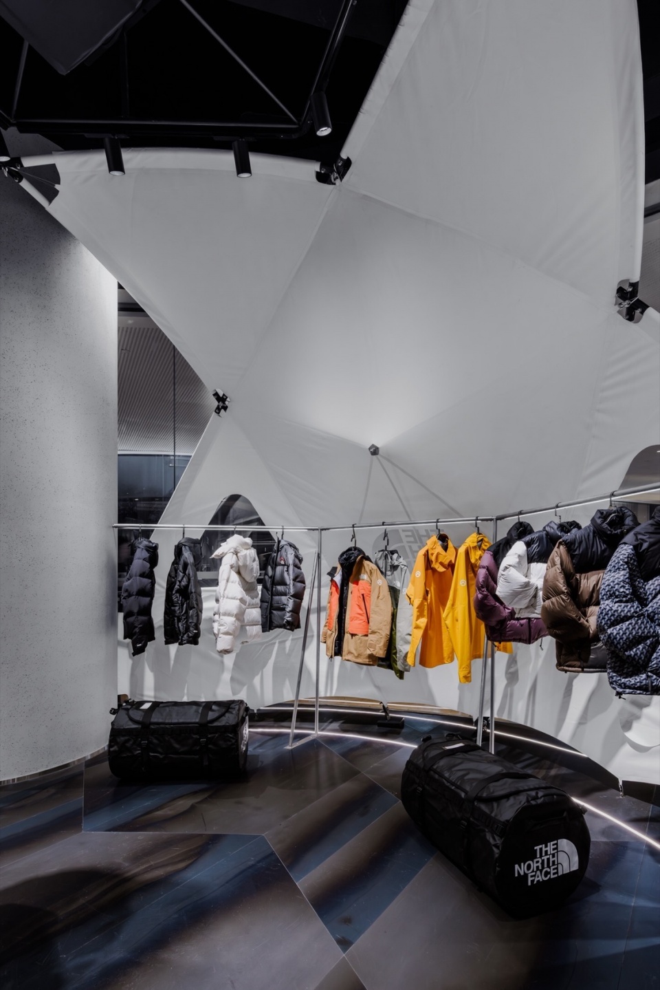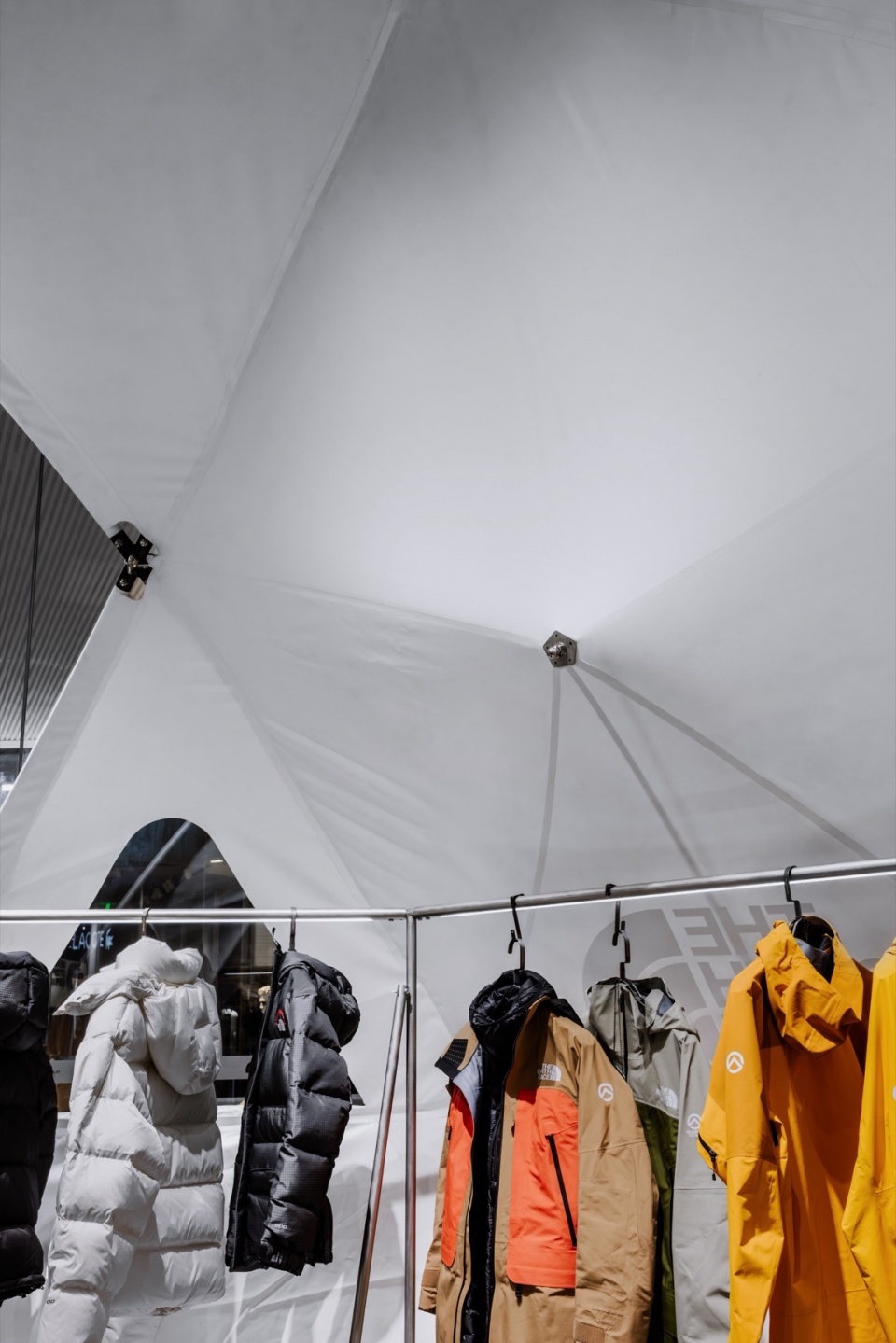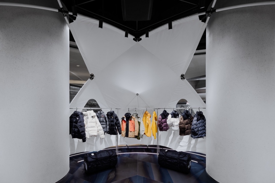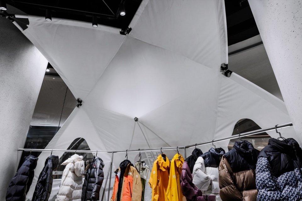 在这一坚韧且富有张力的空间中,我们打造了以户外帐篷为灵感的墙面系统,并引入以 TNF Geodome 为灵感的半球形帐篷。通过钢结构与 PVC膜材质构建出 “Urban Shelter” 作为销售区域。刚与柔、都市与自然的鲜明对比,使整个空间完美呈现 UE 产品所追求的功能性与设计美学的平衡,让都市探索者在日常生活中也能感受到户外精神的延续。