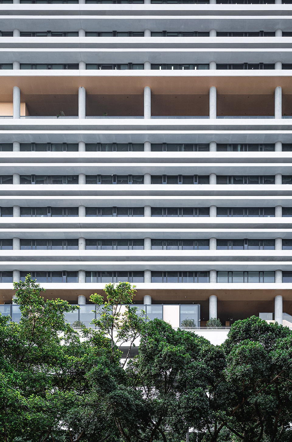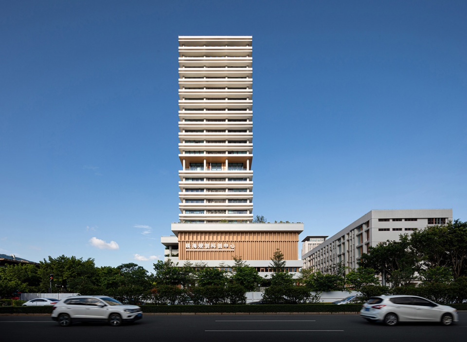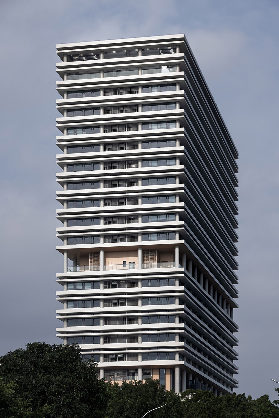 Zhuhai’s intense sunlight inspired 1.7m-deep concrete sunshades—a façade-defining element that conceals windows in shadow and enables passive cooling. These rhythmic horizontal bands create sculptural depth while serving functional and aesthetic purposes.