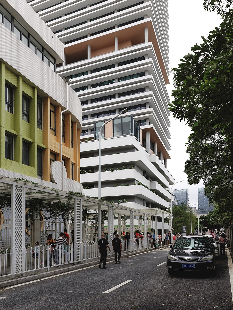 The podium, housing a municipal parking garage, faces conflicting contexts: urban streets to the north and a school to the south. To soften its bulk, horizontal sunshades morph into staggered planters supporting diverse vegetation, creating rich shading effects. The resulting vertical garden masks the parking function, offering students a living green facade instead of a monotonous structure.