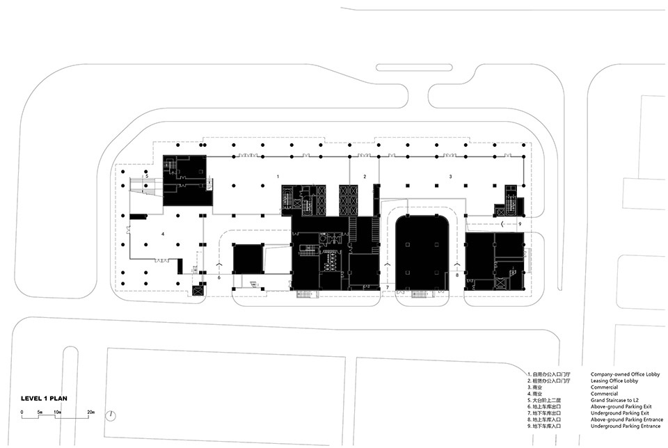 建筑各功能按照竖直方向进行布置。自下而上依次为公共停车场、出租办公和自用办公总部三大部分。在各功能的体块之间则插入了公共餐厅,咖啡,体育馆,会议室和报告厅,企业展厅等公共设施。这些缝隙空间成为供人“自由呼吸”的空中平台,让人们在办公之余可以到此放松休憩。