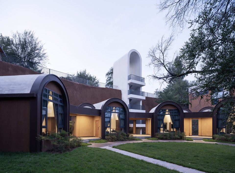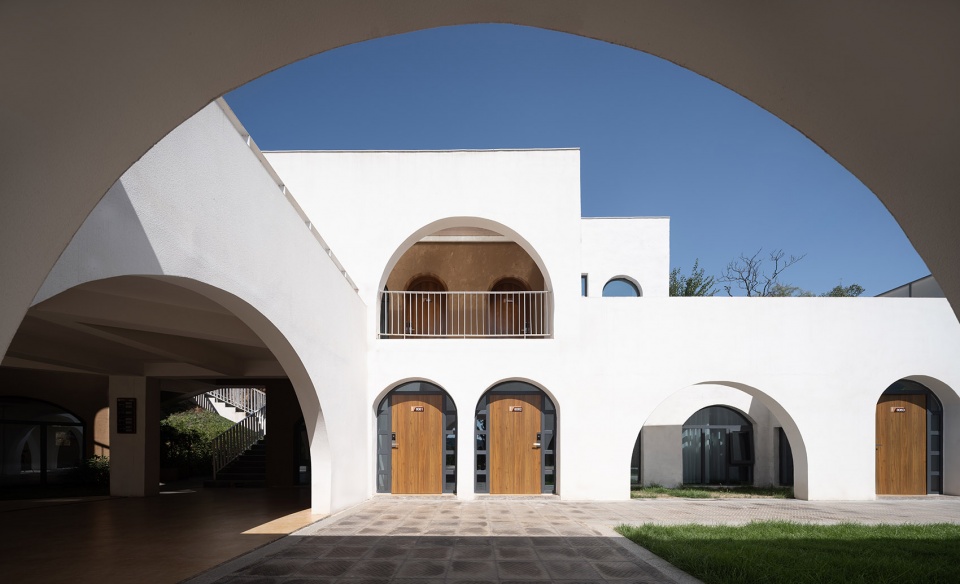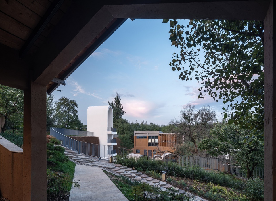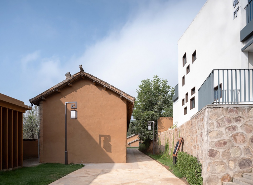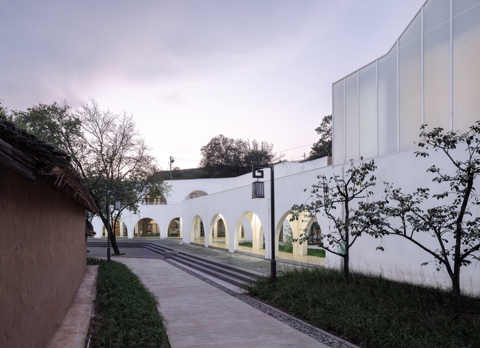 在村落最北侧的一组建筑,继续沿用了窑洞的意向,只是这一意象成为建筑立面、拱廊的符号,并用白色作为立面的主要用色,甚至采用碳酸聚酯中空板这一轻质的材料对简单朴素的建筑体量进行塑形,这是一种经济但是适宜的方法,在乡村建筑中的材料实验。是田家庄再生设计中,谨慎、协调的整体思路的略微放纵,作为空间序列最后的高潮。