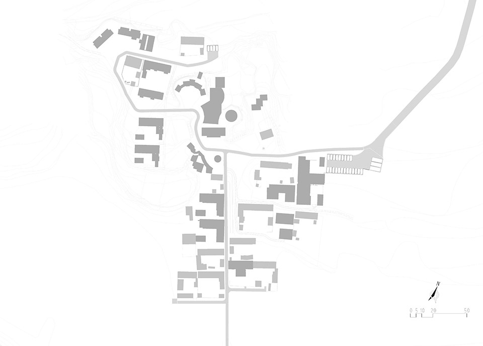 The cafe connects to the central square and leads to the residential compound on the terrace on the west side. The stone facades, as well as the scattered building Spaces and roof terraces, integrate themselves into the overall spatial structure, and the seemingly arbitrary spatial transformation reflects the logic of integrating the height difference and the sight line.