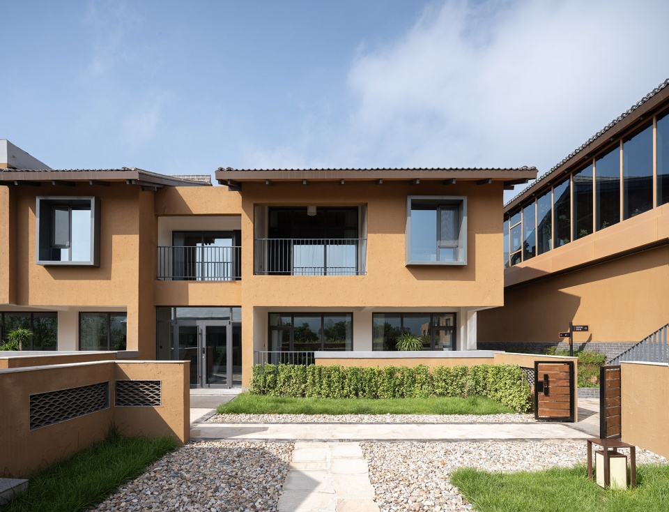 Entering a semi-enclosed courtyard through a glass building with a steel structure, you will find a two-story building with a traditional straw-mud plaster facade, featuring multifunctional rooms. The ground floor serves as a private dining rooms, while the upstairs offers comfortable bedrooms. Proceeding southwards, you will find the restaurant and kitchen, which along with the management service rooms across the alley, form the main service spaces of the reception center.