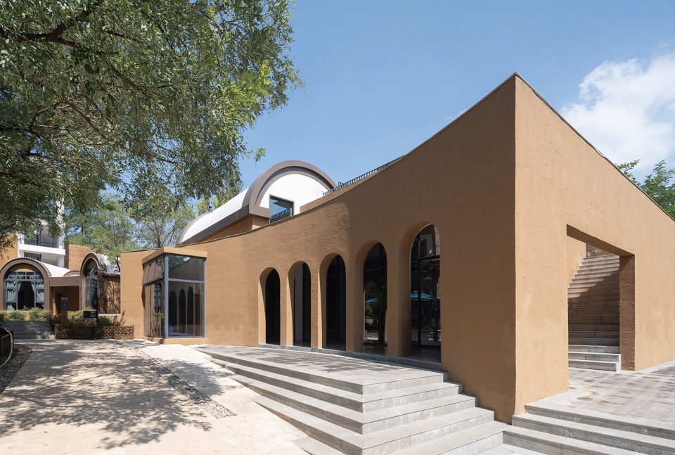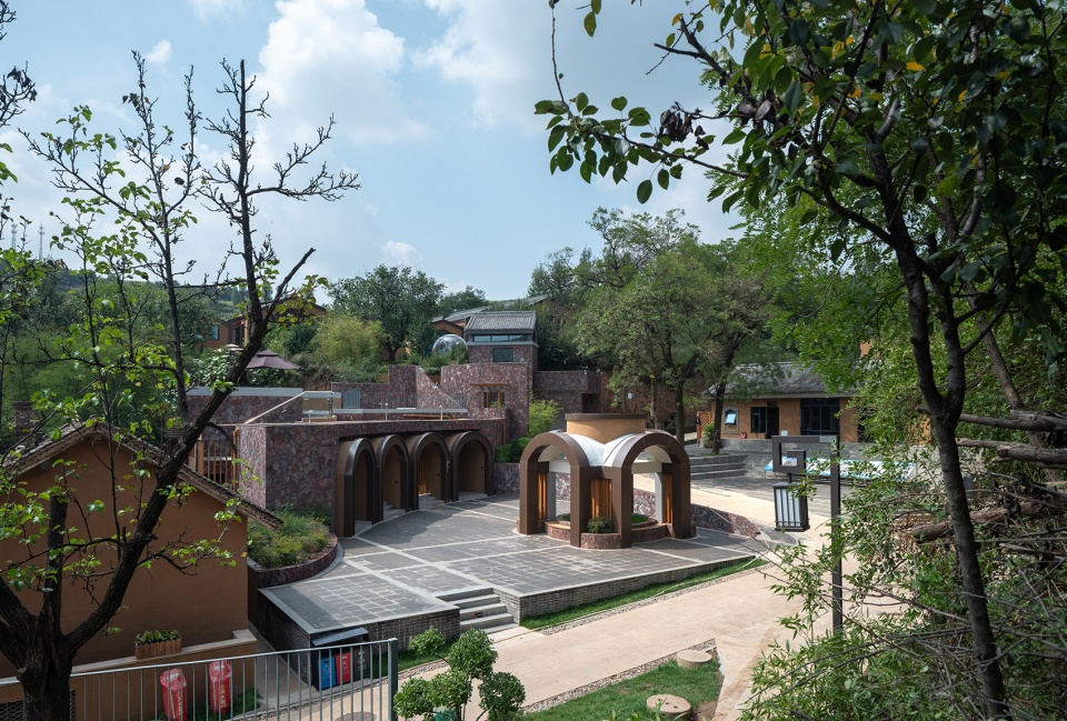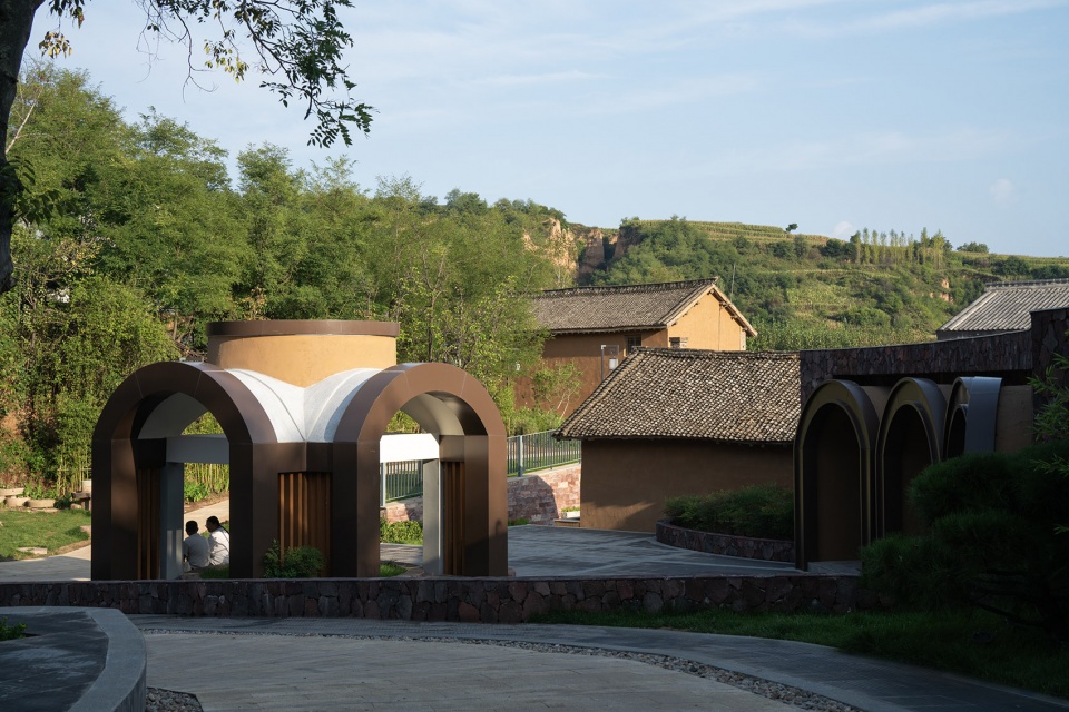 At the junction of the main north-south road and the west side of the tourist reception center, a square is created by displacing a residential house. The square adapts to the overall terrain with steps, retaining three existing trees as landmarks. The renovated store on the north side and the newly built self-service coffee shop on the southwest side enclose the square. The simple grid paving unifies the irregular space, with the only “movement” attempting to reflect the center’s design at the southwest corner of the road intersection. The pavilion features cave arches and includes a flower bed and seats, corresponding to the open roof and expressing an open space concept. However, the sturdy structure implies the regional characteristics of northern China and the thickness of cave dwellings.