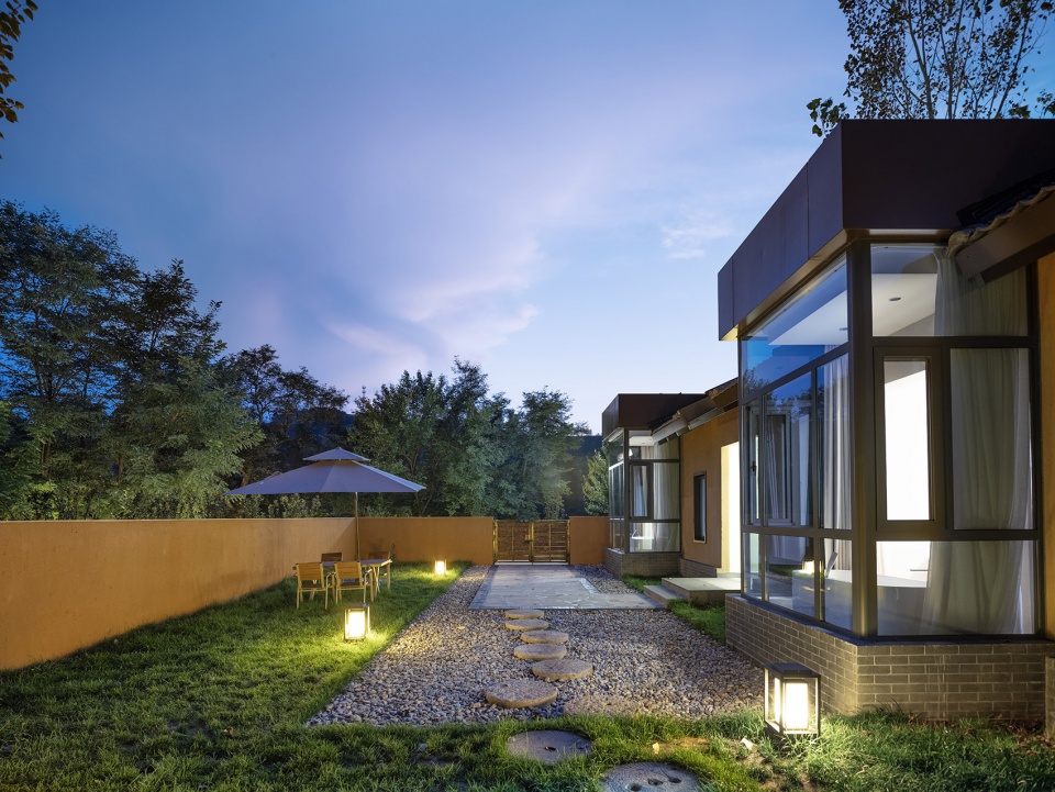 穿过钢结构的玻璃建筑,进入一个较为封闭的半围合院落,采用传统的草泥灰抹灰立面的两层建筑是具有多功能的房间,下层是餐厅的包房,上层则是舒适的卧室。再往南,则是餐厅和厨房,它们与巷子对面的管理服务用房形成了接待中心的主要服务空间。