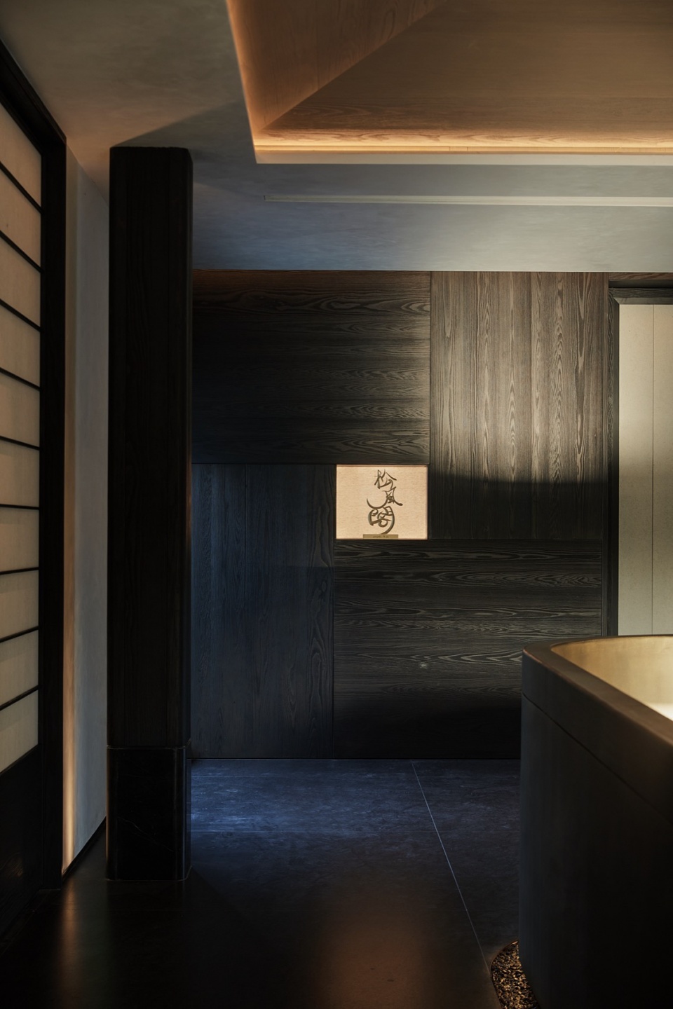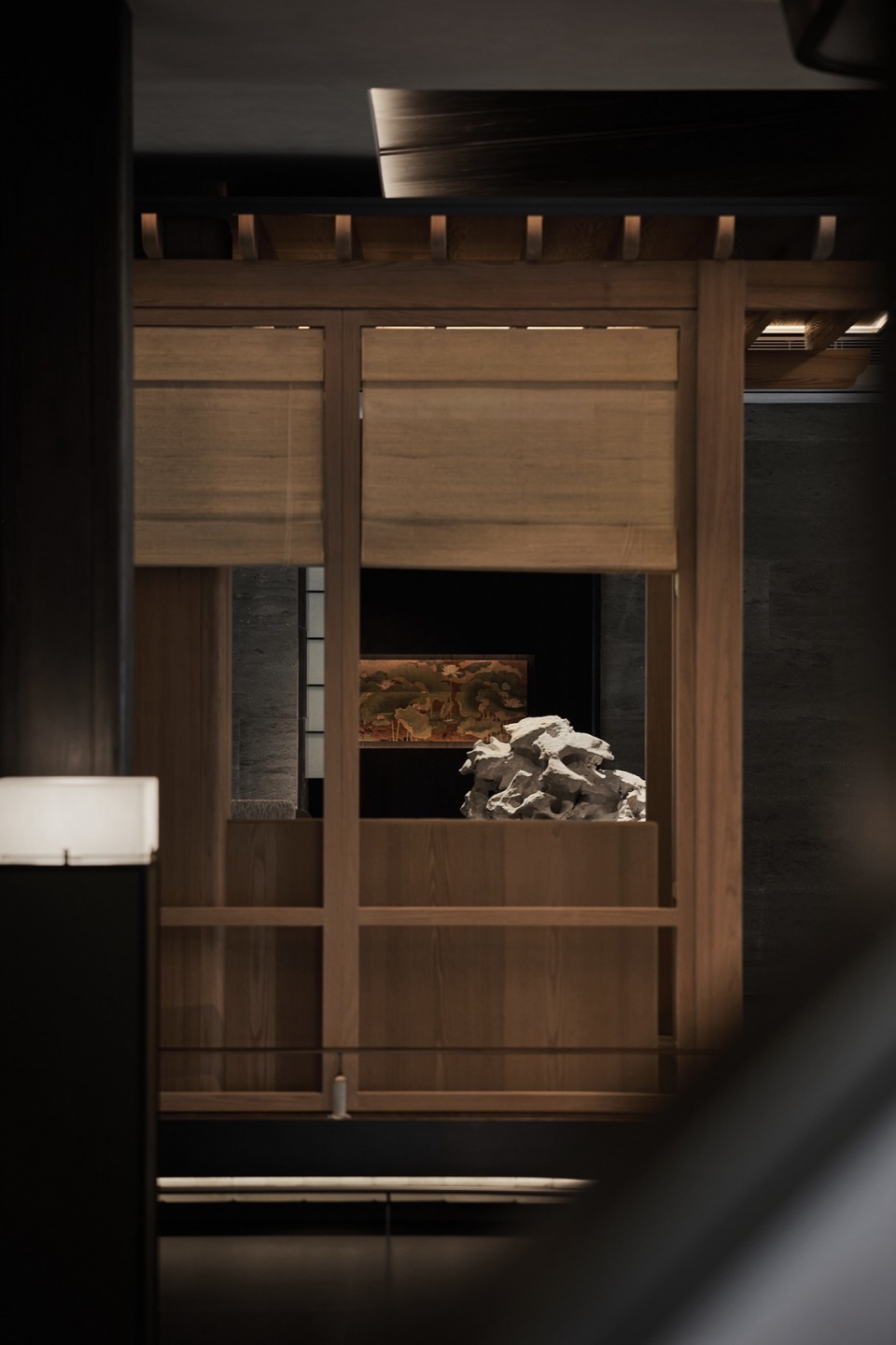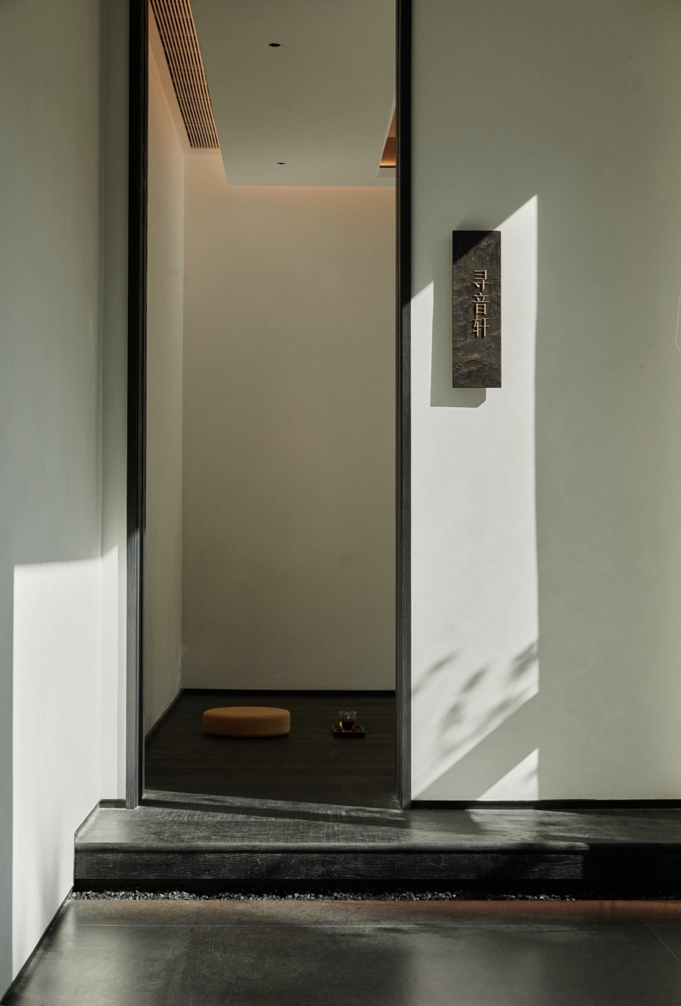 抬高处理的茶台,以几何体块构筑空间序列。雪松木皮肌理如山水皴笔,在触手可及的肌理间,纳入自然的呼吸感。
