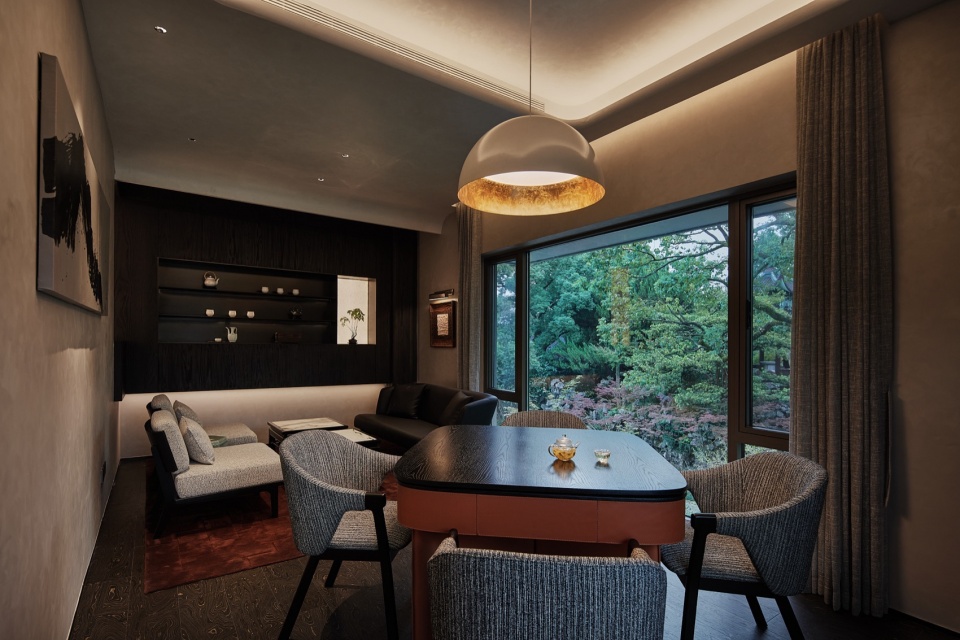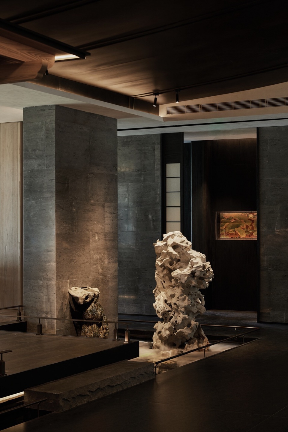 Floor-to-ceiling windows frame West Lake’s four seasons into a three-dimensional scroll. With every step, sip of tea, or gathering conversation, the lake and mountains unfurl like an ink painting. As sightlines follow the winding corridor, a clear pool murmurs gently. Amidst shimmering reflections, the jagged silhouette of a Taihu rock stands poised—capturing the essence of distant peaks and intimate waters, silently echoing the dialogue between interior artistry and the landscape beyond.