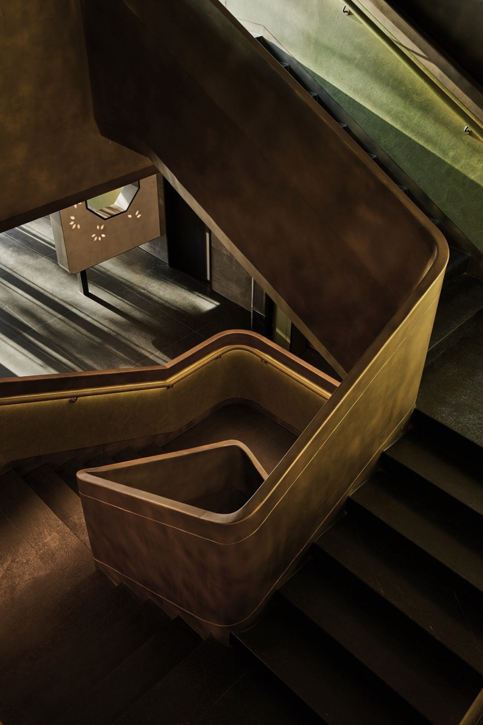 雕塑感十足的楼梯亦为一处点睛之笔。古铜色螺旋楼梯内嵌翠木扶手,如青蛇盘绕而上,融合顶端悬球形灯珠,构成”青蛇戏珠”的东方意象,引人联想至雷峰塔传说。