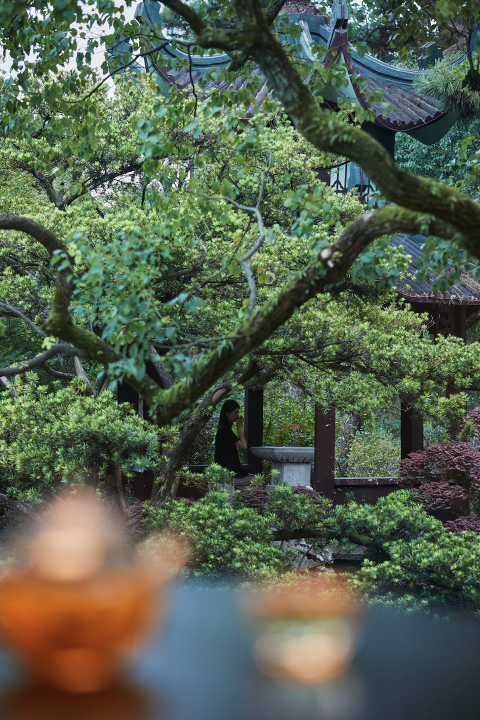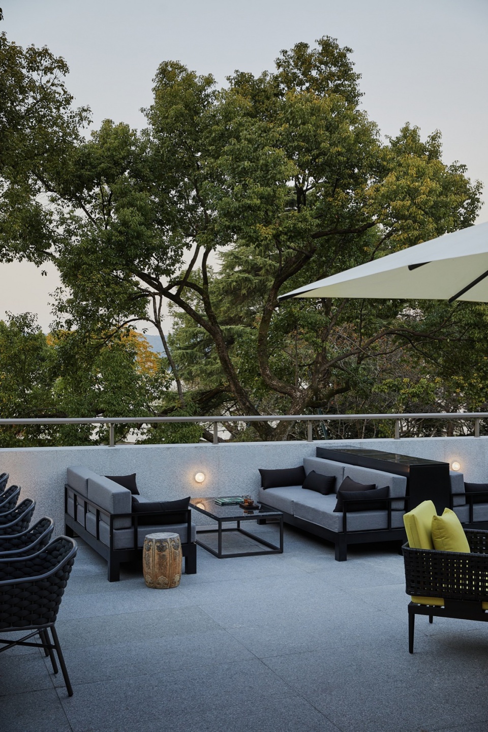 隐于古树间的室外露台,与湖景对望。春秋两季,乘气温刚好,望湖品茶,枝桠掩映处偶现雷峰塔影,更添几分禅意。