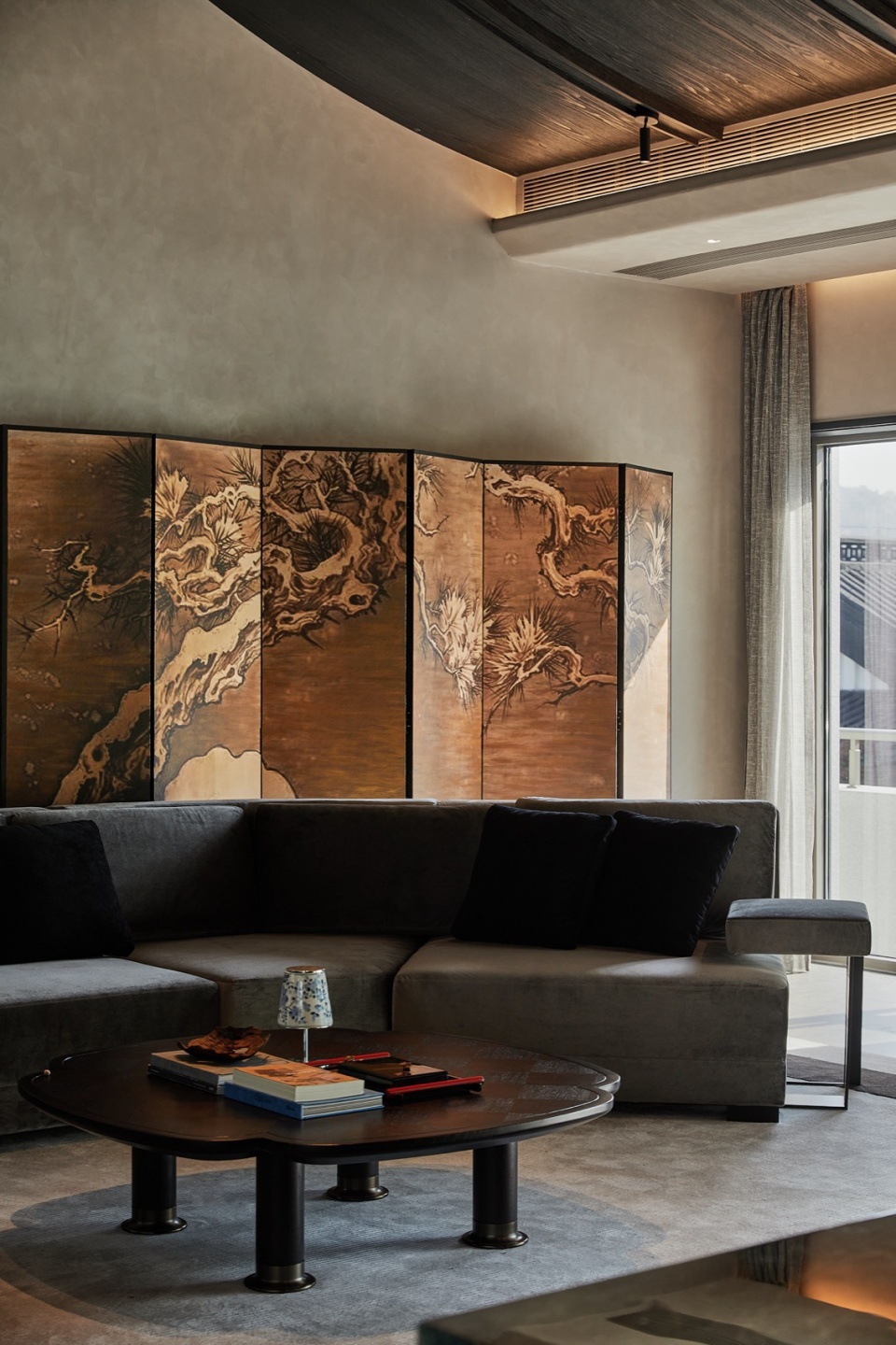 Through the corridor dappled with interplaying light and shadow, the tatami-style Melody Pavilion comes into view. Its full-height south-facing glass wall acts as a natural picture frame, seamlessly blending the hotel’s landscaped gardens into the interior space.