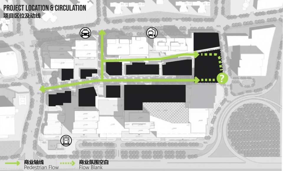 The project faces two key challenges. First, although the inner alley and the high street converge at Water Plaza, the commercial atmosphere at this junction is weak, making it difficult to form a complete and continuous retail loop. Second, the site lies at the terminal end of the high street, lacking a strong visual presence or iconic identity, thereby failing to create a compelling focal point for the axial view. These site conditions directly undermine the area’s commercial vitality and spatial quality.