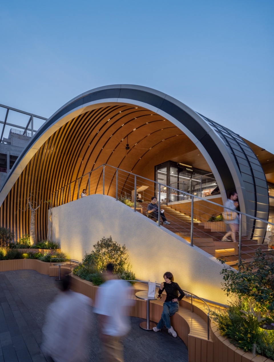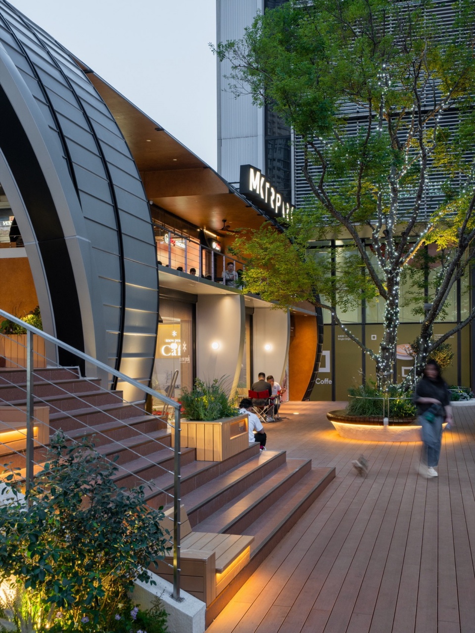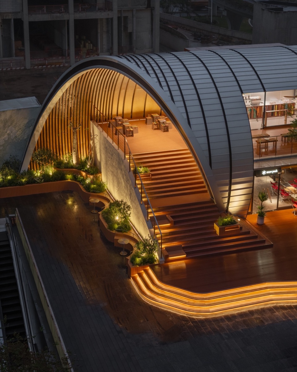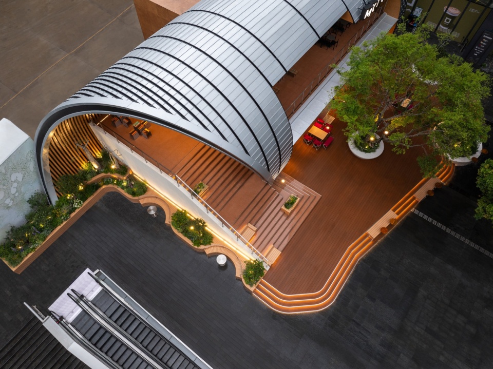 The architectural form is anchored by a minimalist steel arch structure with an 18-meter span, which defines the entire composition. The south façade is fully open, maximizing visibility and commercial exposure. A large staircase canopy leading to the second level is skillfully carved from the arch’s geometry, seamlessly integrating form and function. Material selection emphasizes duality: a silver aluminum roof echoes the neighboring architecture and reinforces a sculptural silhouette, while the pedestrian-level scale incorporates wood and wood-colored fluorocarbon-coated aluminum panels to create a warm, relaxed atmosphere. The landscape design follows a strategy of “blurred boundaries,” allowing commercial energy to naturally flow into public zones and forming a seamless transition between public, leisure, and retail spaces.