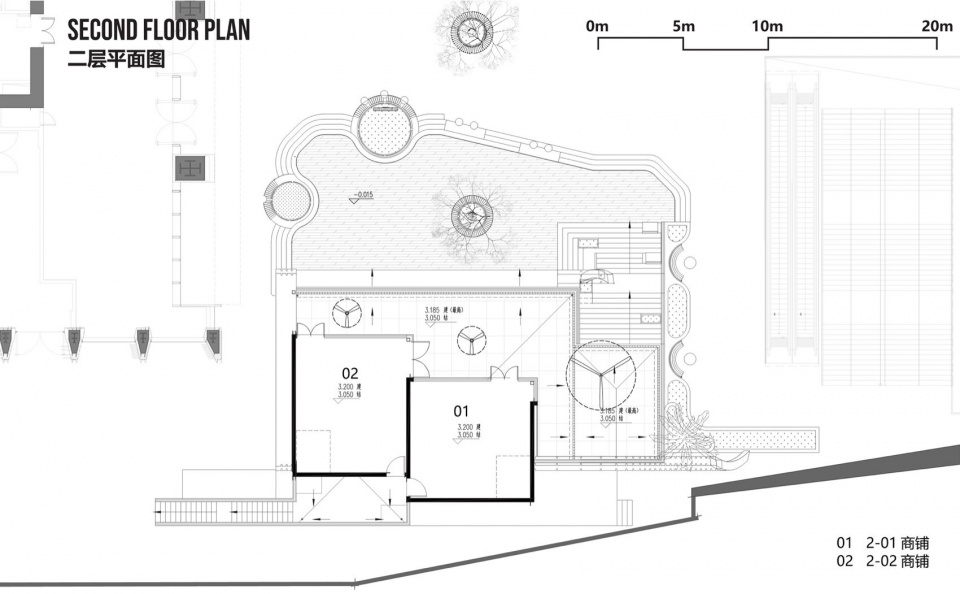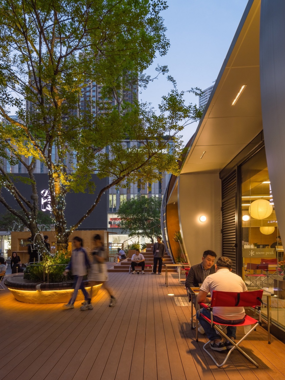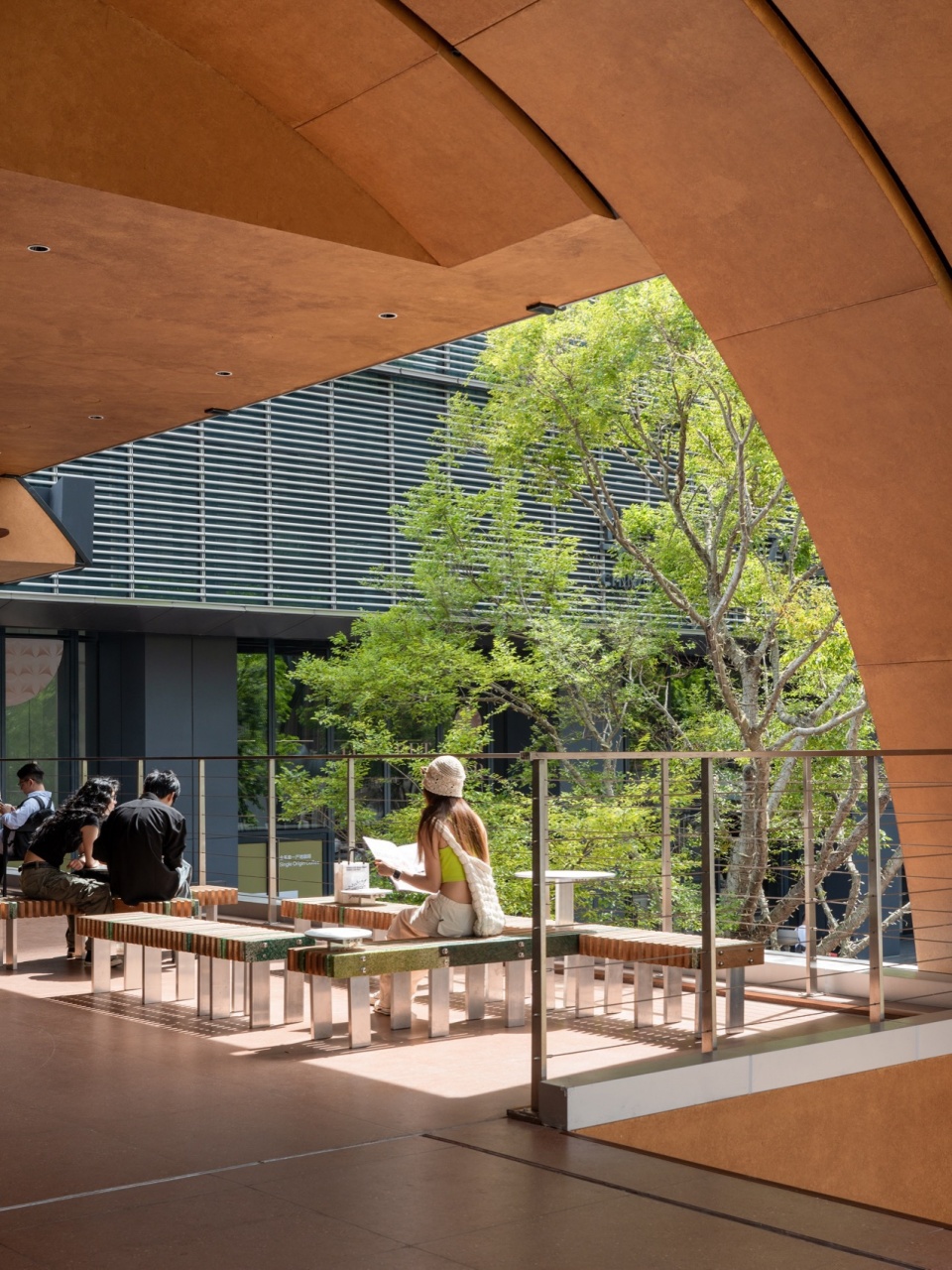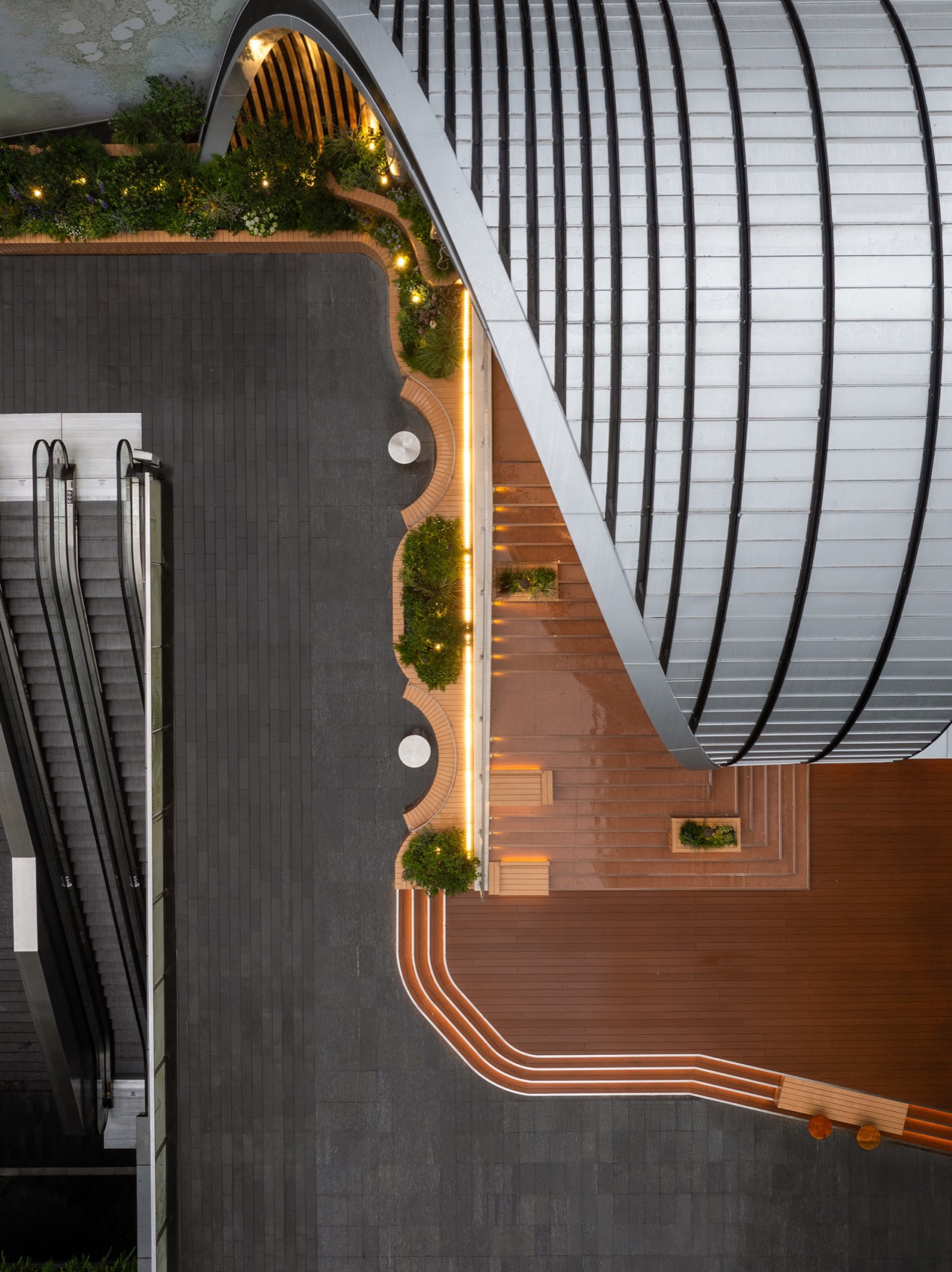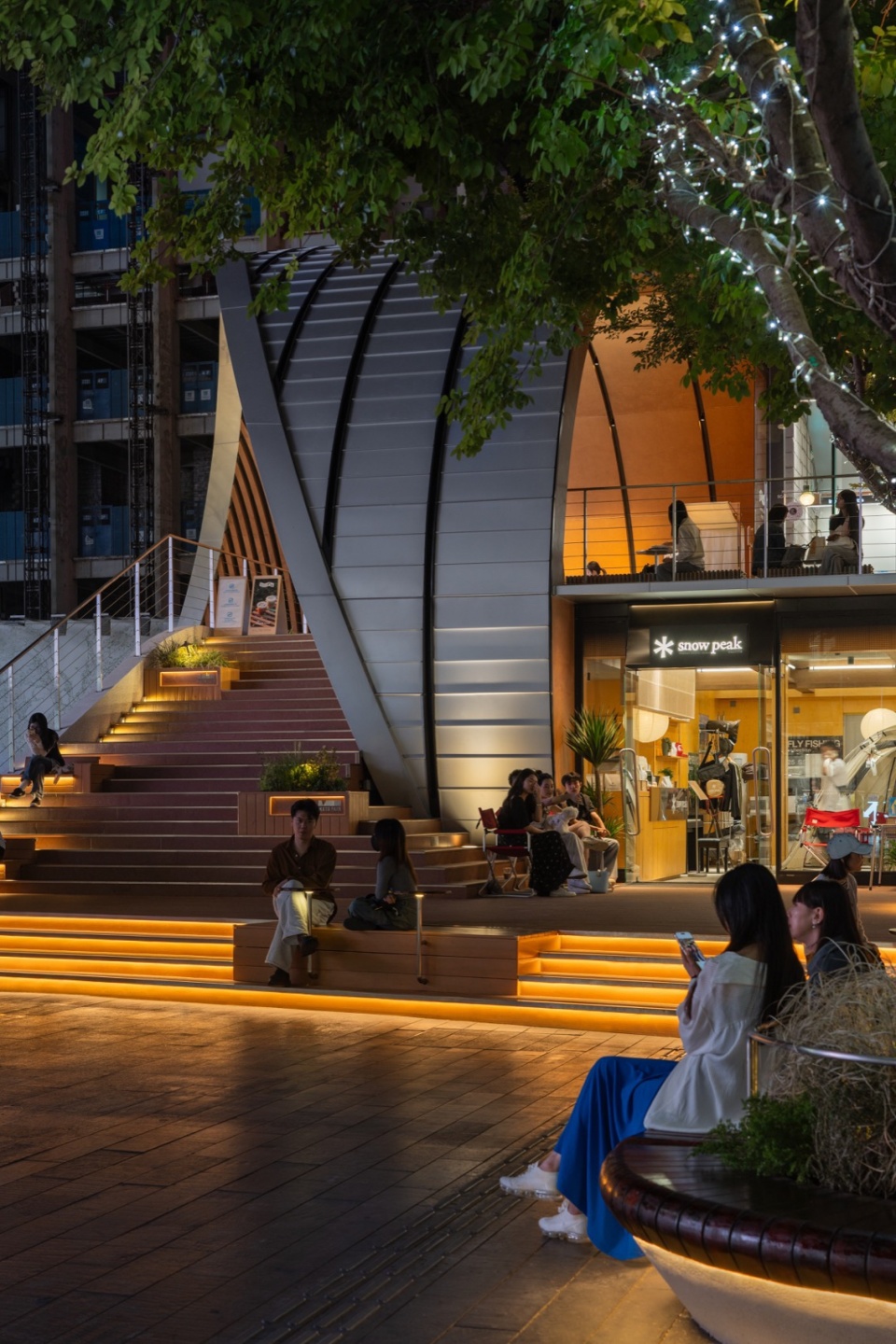 The architectural form is anchored by a minimalist steel arch structure with an 18-meter span, which defines the entire composition. The south façade is fully open, maximizing visibility and commercial exposure. A large staircase canopy leading to the second level is skillfully carved from the arch’s geometry, seamlessly integrating form and function. Material selection emphasizes duality: a silver aluminum roof echoes the neighboring architecture and reinforces a sculptural silhouette, while the pedestrian-level scale incorporates wood and wood-colored fluorocarbon-coated aluminum panels to create a warm, relaxed atmosphere. The landscape design follows a strategy of “blurred boundaries,” allowing commercial energy to naturally flow into public zones and forming a seamless transition between public, leisure, and retail spaces.
