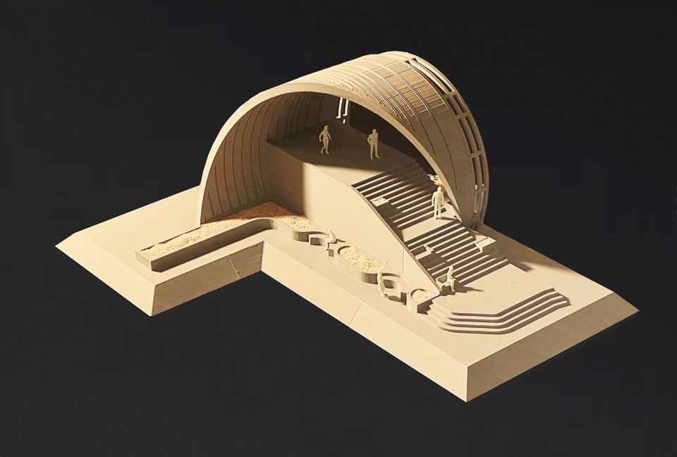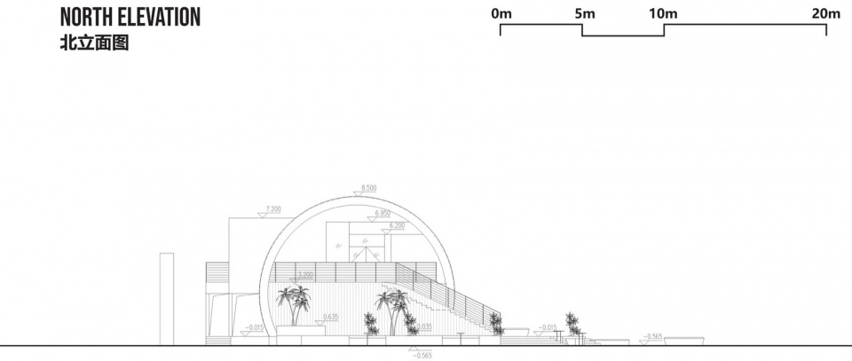 设计团队通过严谨的”找形”过程,最终选定圆柱形体量作为解决方案。这一选择基于三点考量:圆形具有理性且谦和的特质;圆柱体能与广场的抱抱象形成视觉对等关系;其完整形态可与周边大体量建筑平等对话。”一拱二阶三舞台”的规划方案应运而生:面向主动线采用布尔手法打开体量,形成开放商业界面;水广场侧设置阶梯式复合平台,通过三个层次激活空间——首层弹性市集区作为过渡空间,二层阶梯看台区创造仪式感体验,顶层空中舞台区打造”空中花园”。