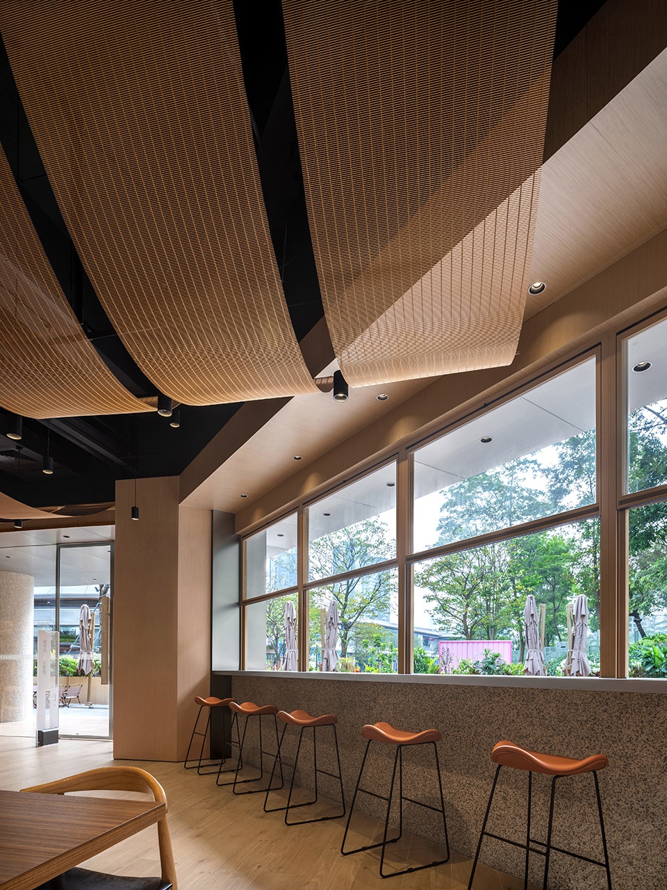 与咖啡区相邻的图书区,设计师以通过疏密渐变排布的木质框架天花构筑视觉韵律。
