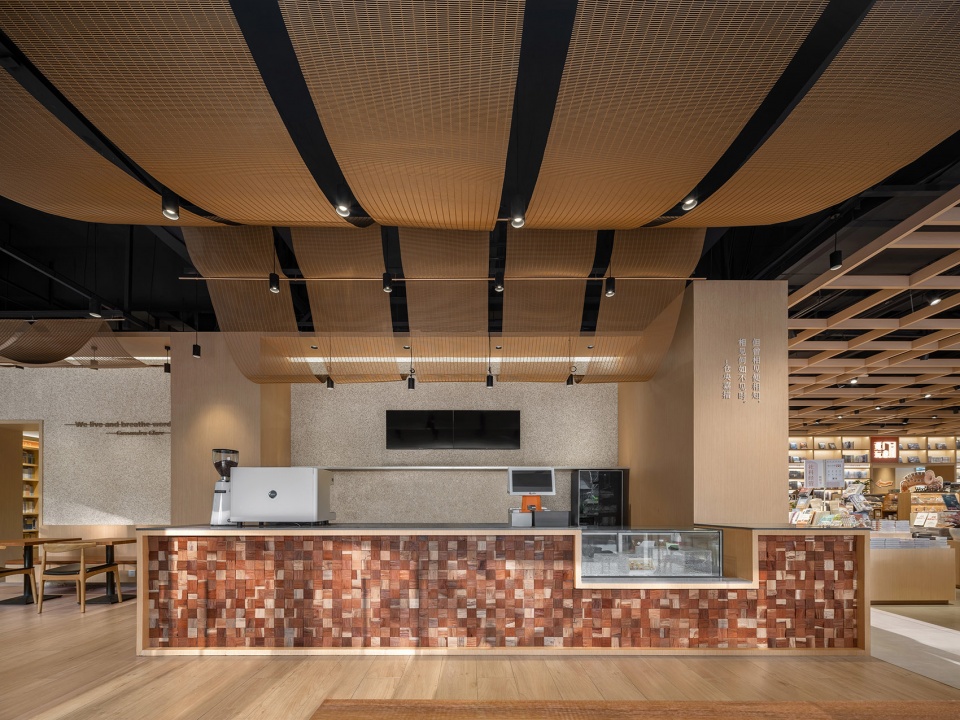Adjacent to the café, the book zone features a wooden ceiling grid with density-modulated rhythms.