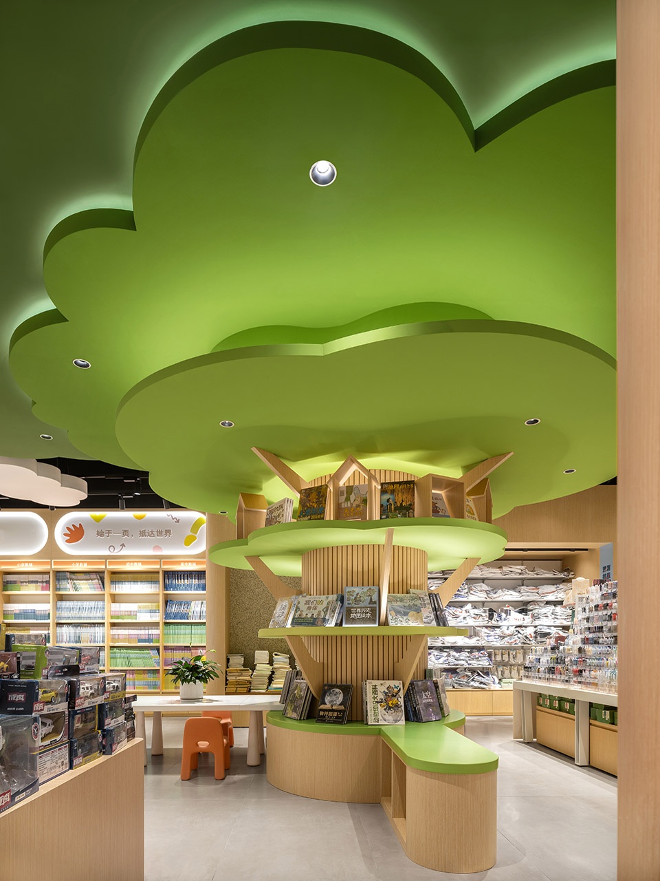 儿童区的设计回应以滨河绿意,通过层叠的弧形绿色层板将树木形态抽象化的引入室内,与窗外绿植形成互文。