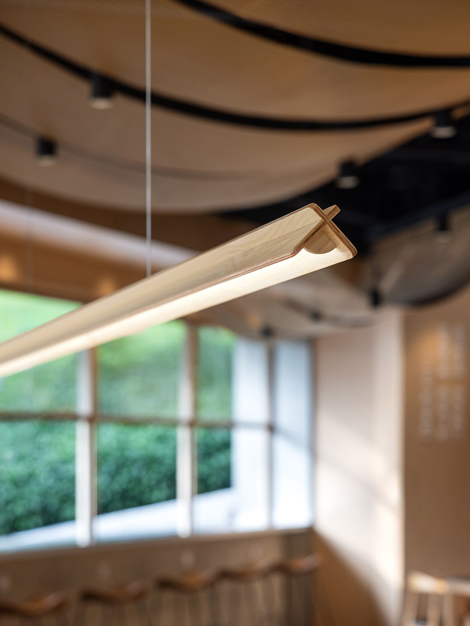设计师将入口一侧的幕墙改造为咖啡对外景观高坐区,与户外庭院相连。木质的窗框将河岸景观分解为连续景观切片,随晨昏光线变化呈现不同时段下的画面。