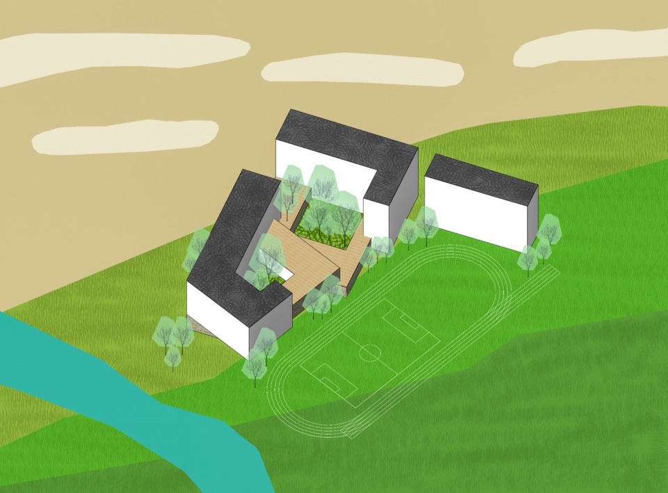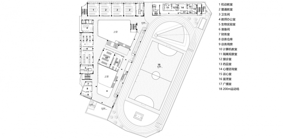The design capitalizes on the landscape resources of the southeastern riverside corridor and Minzhi Reservoir, strategically positioning the sports field along the eastern boundary through a semi-enclosed courtyard layout. This orientation aligns the campus with the eastern landscape belt, fostering seamless integration and mutual permeability between the open sports field and the adjacent green space, while simultaneously alleviating the spatial compression from neighboring super high-rise residences. By employing landscape borrowing techniques and systematically integrating surrounding scenic assets, the scheme cultivates expansive activity and recreation zones, reinforcing an organic dialogue between the campus and its urban environment through deliberate spatial choreography.