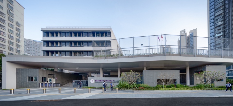 The Minzhi Campus of Shenzhen Longhua Senior High School Education Group is situated within the urban renewal unit area of Hengling Old Village in Minzhi Subdistrict, Longhua District. Its location context exhibits diverse and mixed characteristics. The site features a natural north-high, south-low terrain with an elevation drop of approximately 3 meters. The eastern boundary adjoins the super high-rise residential complex Hefengxuan, while the northern side borders an under-construction super high-rise residential development and kindergarten. To the west lies a high-density urban village, and the southern edge connects to a planned 44-meter-wide riverside landscape corridor. This complex spatial configuration creates a distinctive urban renewal context for the project. The total site area is 9,393.86㎡, the total construction area is 23,762㎡, and the floor area ratio is 2.08, proposed construction of a junior high school with 18 classes.