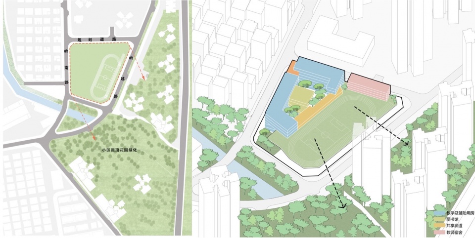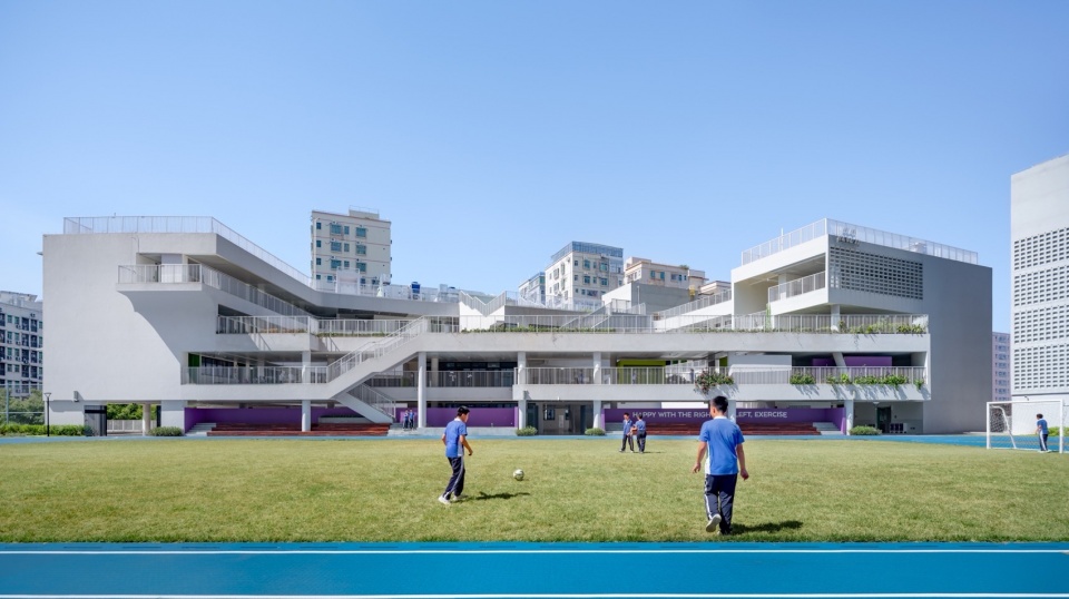 设计基于东南侧河道景观及民治水库景观的资源优势,在总体布局上将运动场置于东侧,采取半围合式庭院设计,使校园朝向东侧景观带,形成校园开放运动场与东侧开敞空间的自然衔接、相互渗透;同时也有效消解了东侧高层住宅带来的空间压迫感。通过周边景观资源的借景与整合,营造开阔舒展的活动与休憩空间,同时强化了校园与城市环境的有机对话。