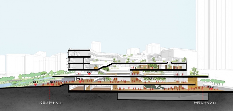 设计利用场地地形高差,设置南北入口与地面有机相接,形成双首层、双入口。场地南侧设置校园人行主入口与二层地面衔接,该入口与河道景观呼应,同时也能利用南侧开阔的河道景观带为校园提供接送等候空间。北侧设置人行次入口和车行出入口,实现人车分流。