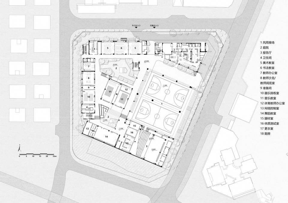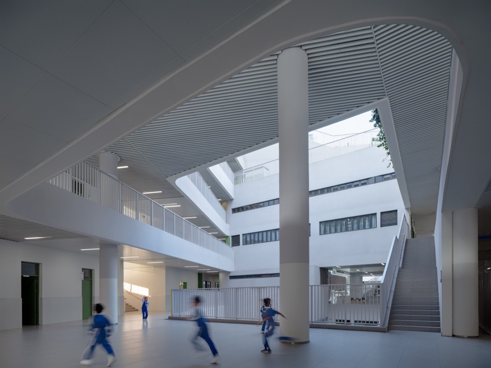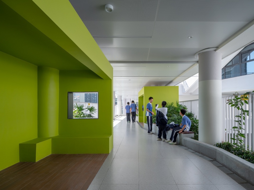 设计充分利用开放河道景观带的资源优势,突破传统校园封闭围墙的固有模式,转而以友好开放的姿态构建积极界面。将校园主入口与运动场挑板下方空间打造为多功能复合的檐下空间系统,设置了兼具家长接送区、临时等候区、文化展览厅及接待区等多种功能的弹性空间,并以园林化的景观手法,塑造出尺度宜人、层次丰富的连续性绿色界面。这些半开放的功能空间既延续了周边城村肌理的小尺度特质,又赋予了校园边界空间全新的文化内涵——既可作为校园德育展示的窗口,又能承载社区文化活动,在空间与人文双重维度上实现了校园与社区的有机共融与良性互动。