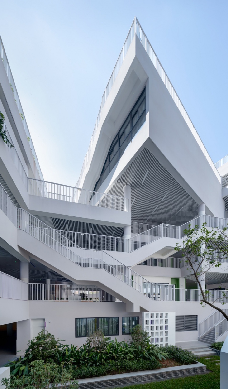 场地处于多元城市要素混杂交织环境中,设计通过简洁的几何体量塑造校园整体形态,以连贯而富有韵律感的立面语言,构建出独特的建筑表情,形成鲜明的校园场所标识性。清晰的形态逻辑和完整的空间序列,在城市新旧交织的肌理中凸显秩序与张力并存的建筑叙事。