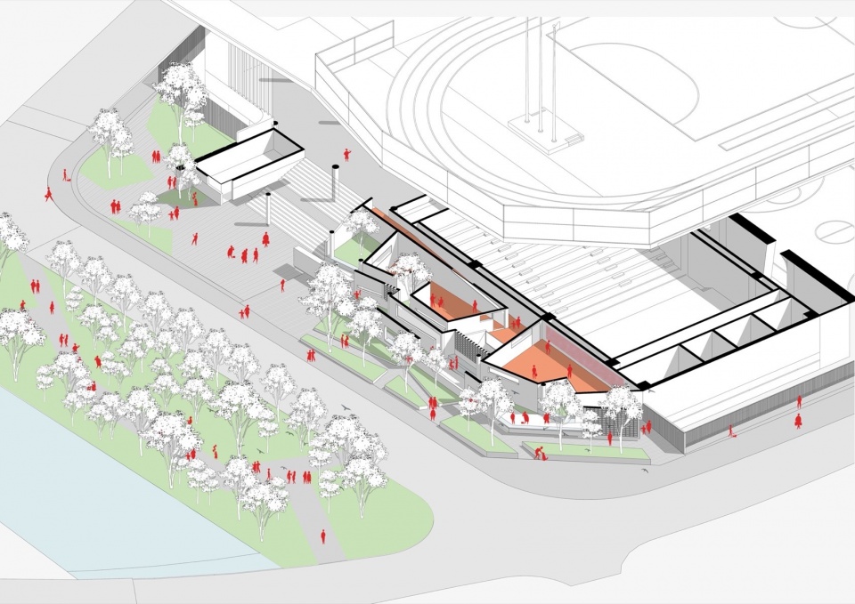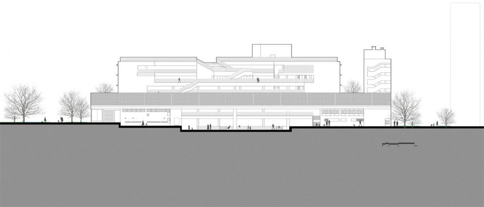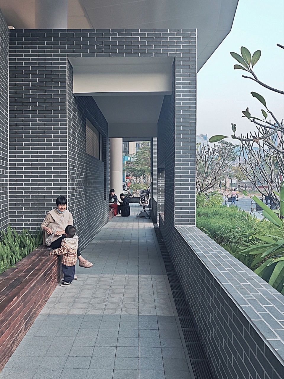 The design leverages the 3-meter elevation drop to create dual ground levels and entrances. The south entrance connects to the riverfront landscape, offering a spacious pick-up/drop-off zone, while the north entrance separates pedestrian system from vehicular system.