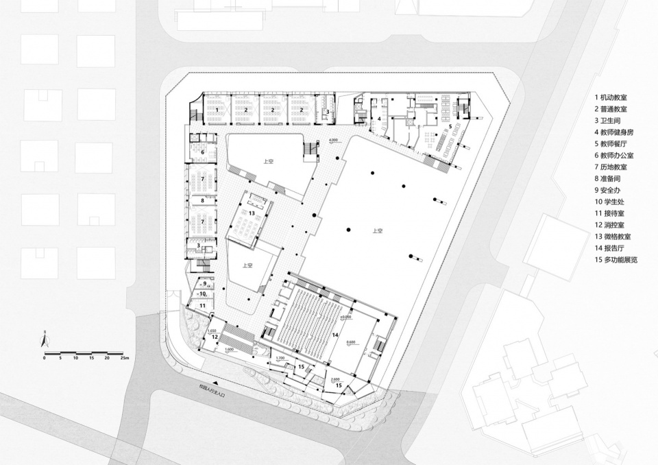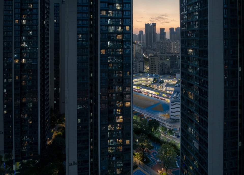 在高密度城市环境与当代新型教育理念交织的背景下,设计思考回应周边复杂城市肌理,结合场地高差,以“集约高效、因地制宜、空间特色、边界共享”为核心理念,探索校园空间营造。通过立体复合的功能组织与紧凑高效的空间架构,实现土地资源的集约化利用。同时巧妙利用地形高差,将其转化为空间塑造的独特语言,打造层次丰富的竖向空间体系。以“园林・书院”为营造愿景,融合书院人文底蕴与现代园林的空间意趣,塑造兼具文化内涵与时代特征的校园空间特色,构建校园与社区共生的活力场域。