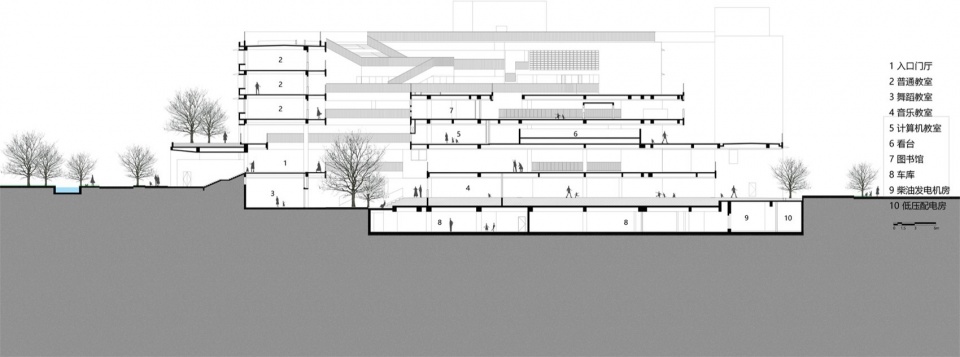 设计通过多层次的立体平台体系,巧妙构建了一所融合书院意境与现代园林的校园。以水平叠加为策略,形成高低错落的立体空间序列,结合垂直绿化系统,打造出富有渗透性的院落体系。