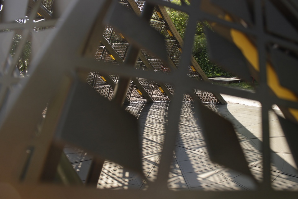 The pavilion’s six metal ribs are angled towards the sun, with the top and bottom arches corresponding to the angle of the sun during the summer and winter solstice respectively. These arches, which are made of beams reused from an earlier project, support triangular panels, which give a dappled shade thanks to the perforated screens of Metadecor’s MD Formatura. The panels are hinged, and open or close in response to the sun. In their resting state, the panels are open to maximise views through the shading screen. Yet in the presence of intense, direct sunlight, individual panels will close to give maximum shade. The impression is akin to a living organism, which changes its posture as the sun moves through the sky, and breathes a sigh during cloudy periods.