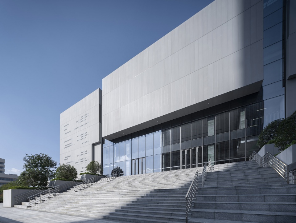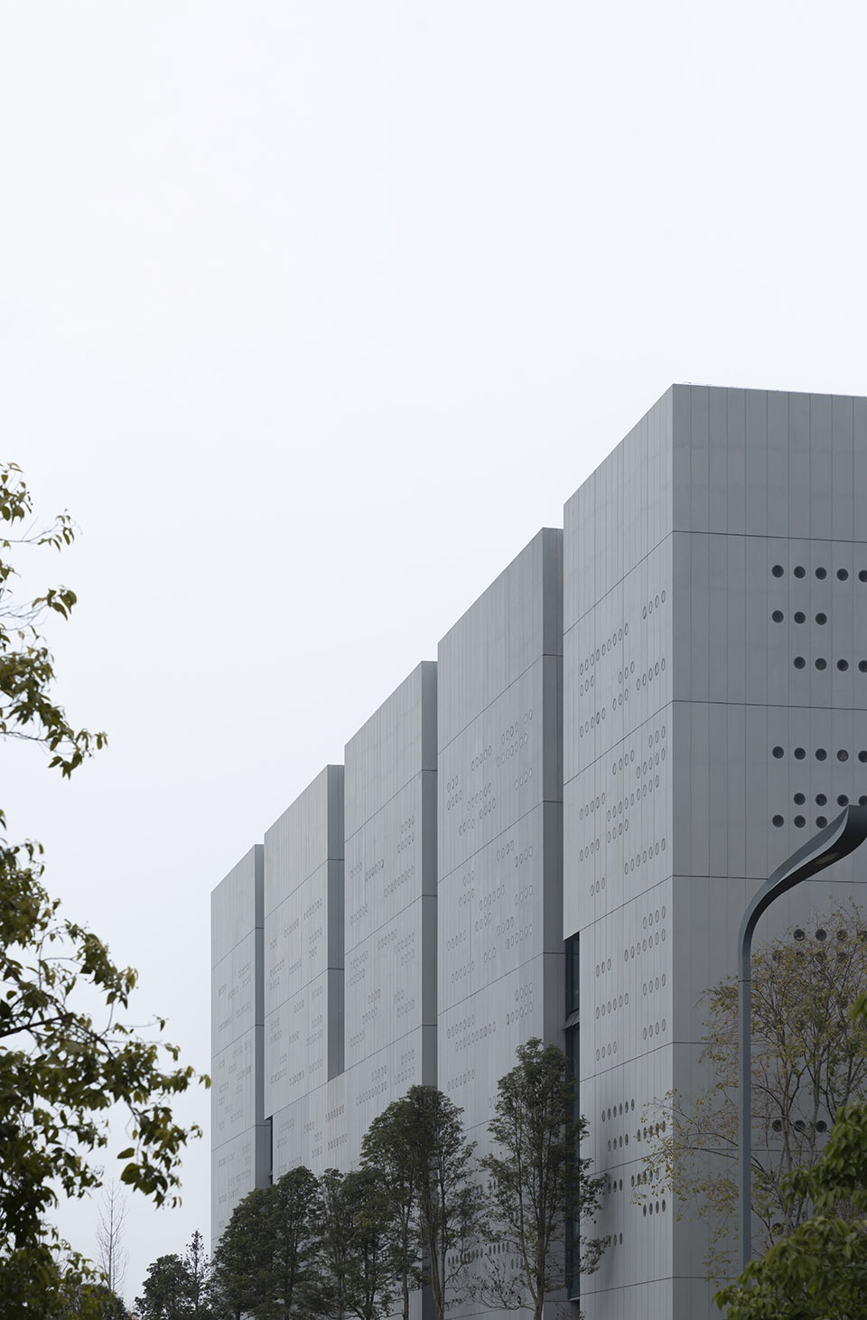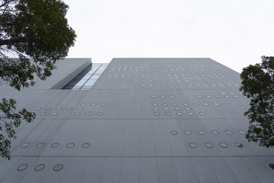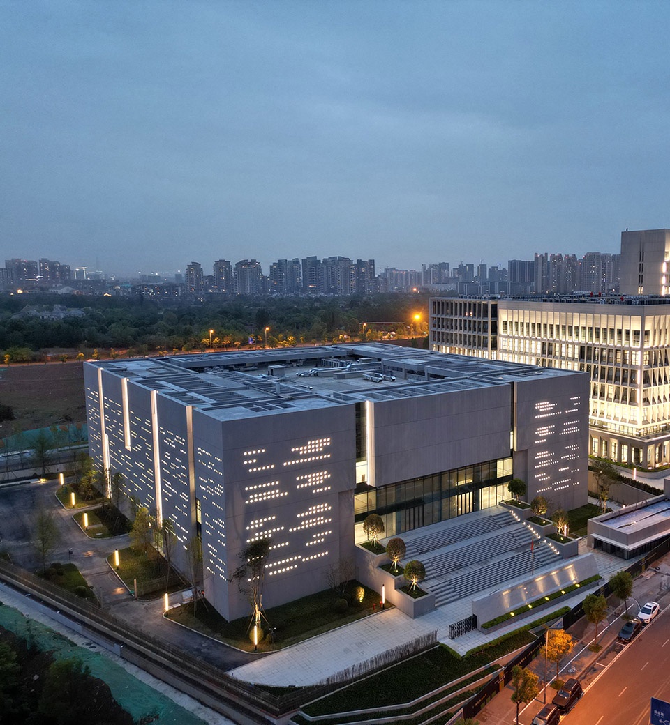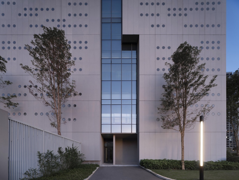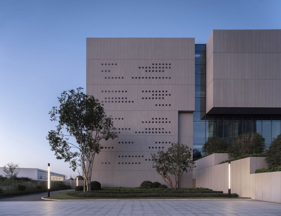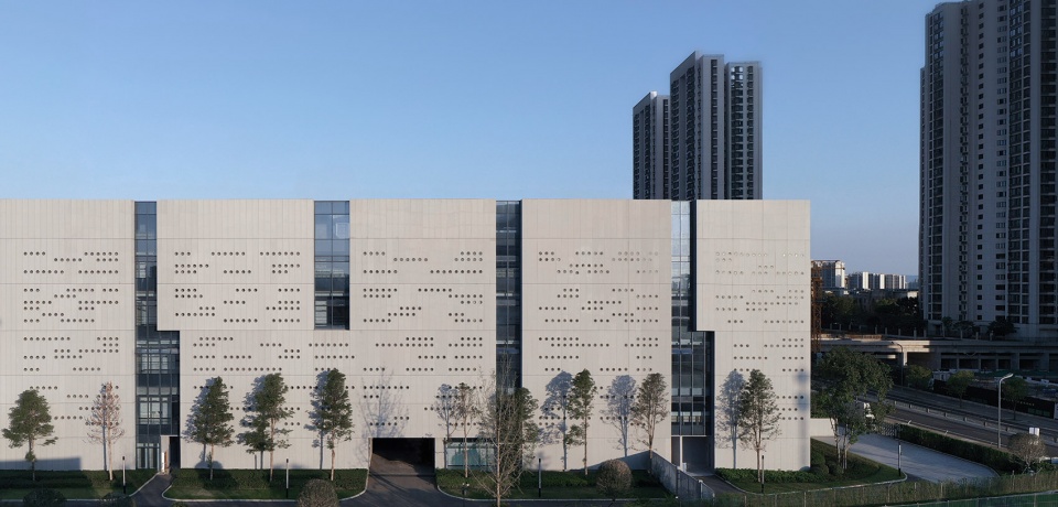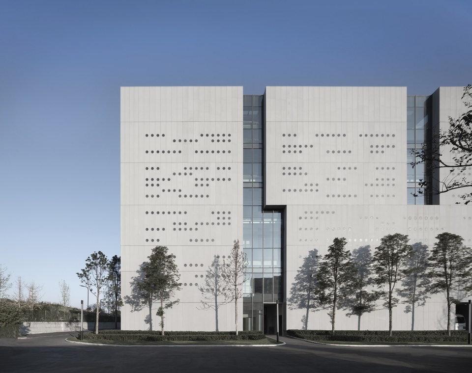 取秦简意向,刻星云法典,同层高的外墙板,随机开洞,犹如一片片刻满文字的竹简。