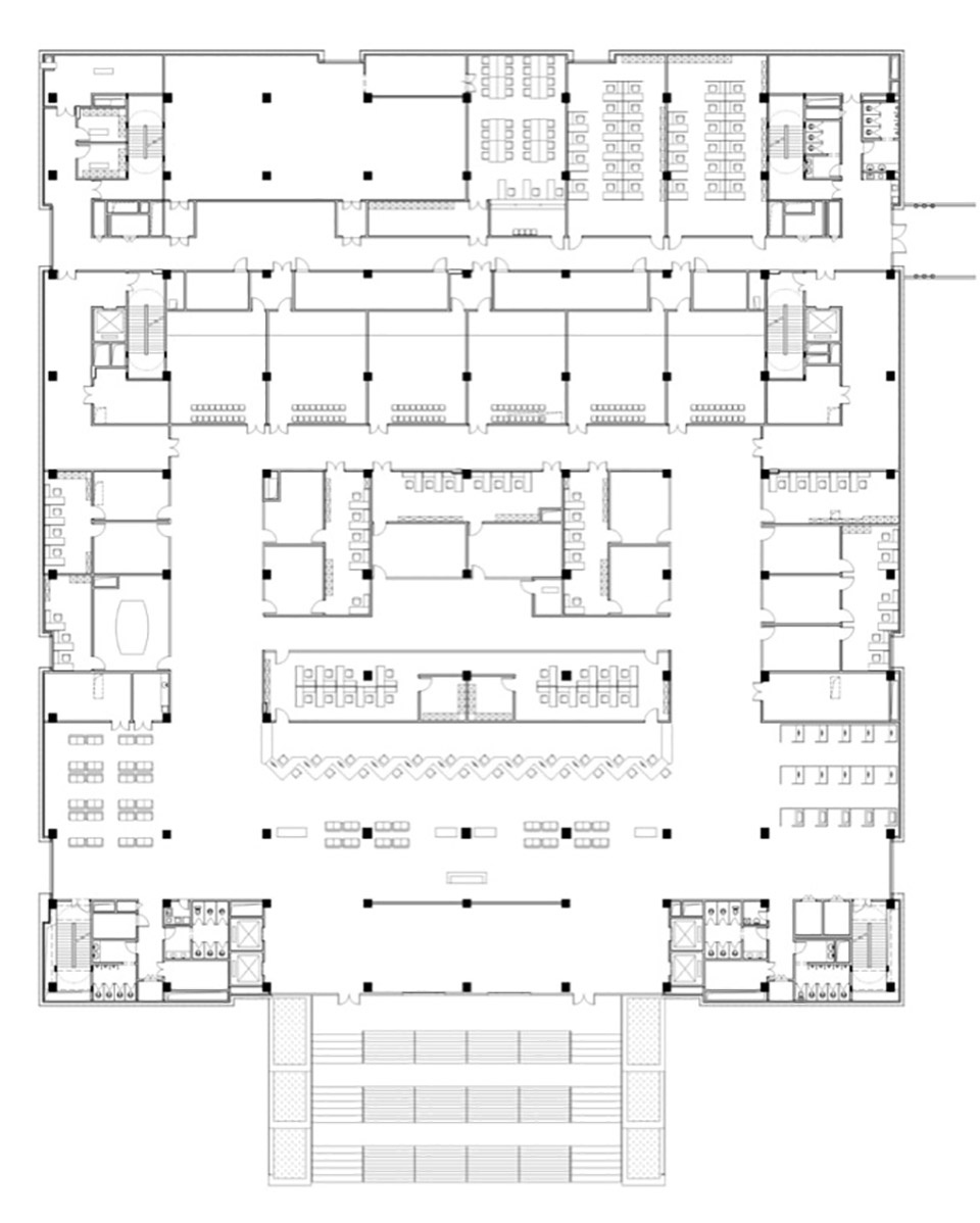 模块化法庭:采用标准化的模块化法庭布置,可根据后期法院需求合并,分隔调整法庭大小及数量;采用环状共建结构,公众及服务用房布置在外环,法官及合议室等布置在内侧,流线清晰,互不干扰,便于管控。