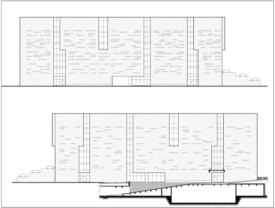 项目用地较为狭小且不规则,场地地势西低东高,根据用地特征,项目采用方正体块植入用地中,根据内部功能进行形体切割,引入“光洞”石壁凿光,解决内部采光,同时塑造厚重形象。