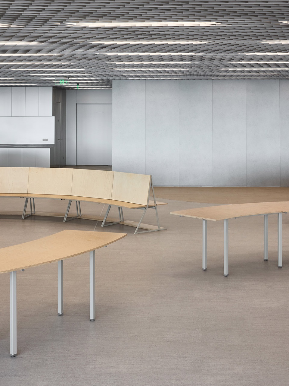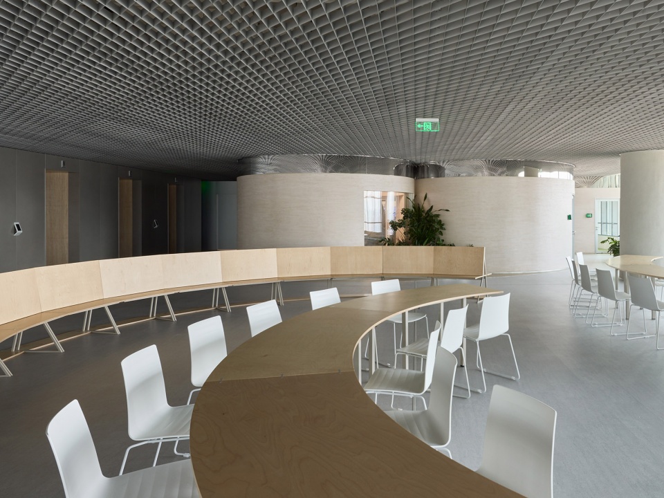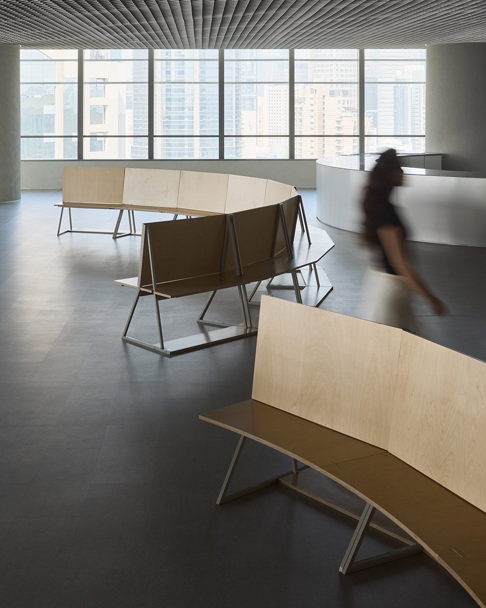 The design intentionally avoids the use of complex props and light. In the public areas, only four types of simple furniture were introduced: sofas by the windows, curved benches with bookshelves, and curved long tables. These pieces are all made in laminated panel and slender steel tube. They can be arranged to accommodate different activities within the space (such as workshops, daily lunches, temporary exhibitions, lecture, and yoga sessions). The units are linked together with extremely simple plug-in connections, requiring no screws or tools.