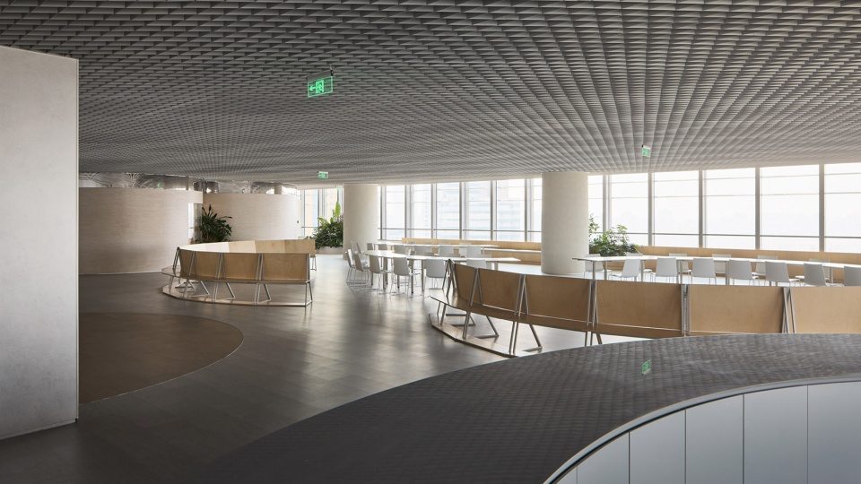 设计将天花和地面理解为最最均质的背景,提供几乎所有关乎舒适的设备。吊顶采用半透和多孔的格栅或张拉网,便于遮蔽点位、日常检修,且保持视觉连续统一。内部办公区域延续了一期可开合张拉网的要素和爪形风口,用浅金色调和办公区超高照度的冰冷感。公共活动区域采用冲孔铝板构成的菱形网格吊顶(而非一期的圆形散流口),以减少大空间回声的问题,并利于布置更均匀温暖的光环境。地面采用平纹或编织PVC,用肌理和颜色的轻微变化限定区域。
