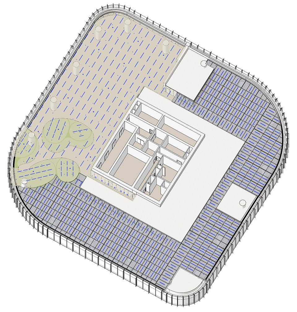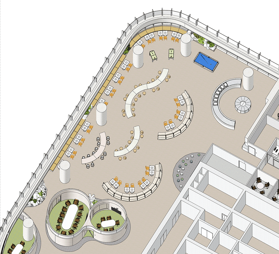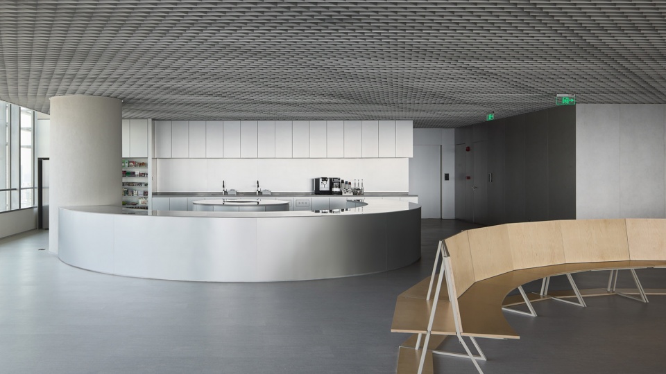 所有电话间、讨论间、会议室都被理解为漂浮在均匀背景上的基础设施胶囊。在外部活动区,会议室卵状紧凑在一起,形成类似花园小径的流动景墙。互相贯穿的开口、团状绿化、低处粗糙的涂料结合高处的镜面不锈钢,都试图给私密要求极高的人工环境增加呼吸和流动感。