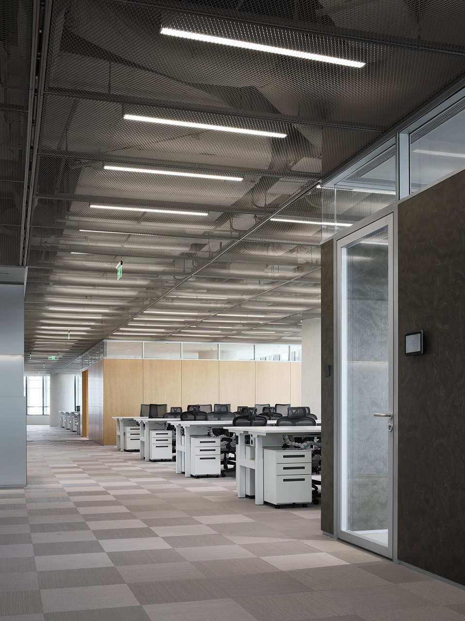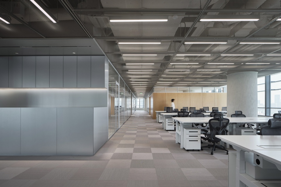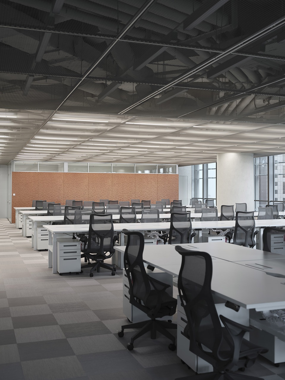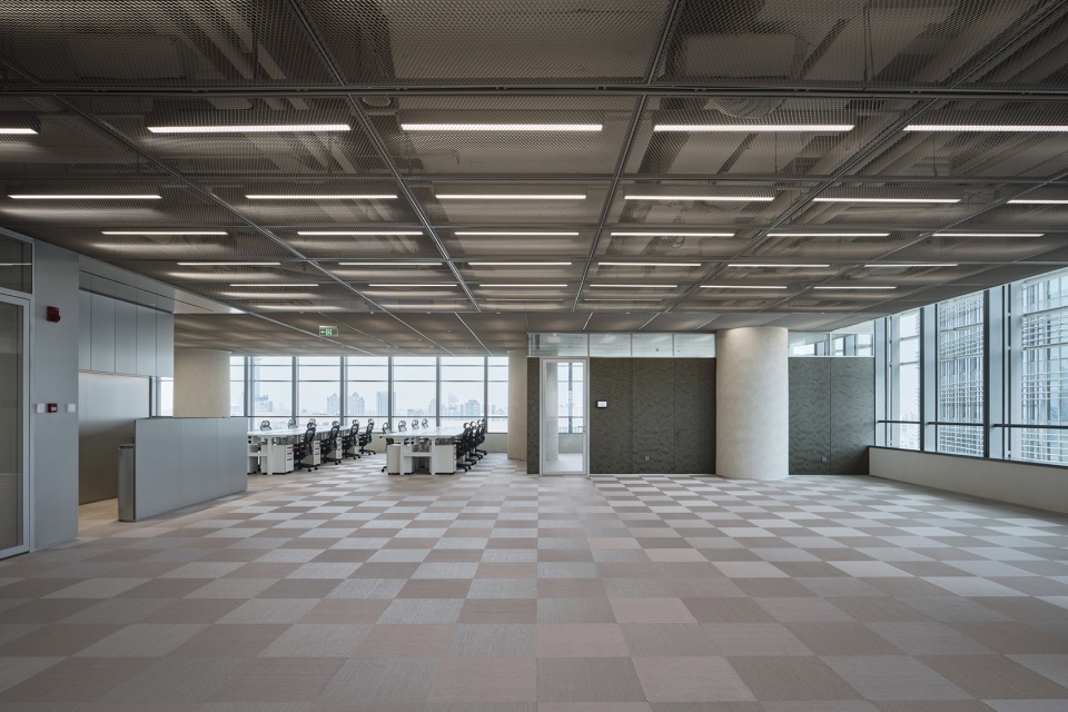 The design treats the ceiling and floor as the most homogeneous background, providing all the MEP and lighting. The ceiling features two types composition, metal mesh and aluminum grid, which allow for easy maintenance while ensuring visual continuity and unity. The work area adopts openable metal mesh and ultra-narrow slot diffuser, all in light gold. The public area is outfitted with a diamond-shaped perforated aluminum grid ceiling to improve acoustic and facilitate an even and warm lighting environment. The floor is covered with plain or woven PVC, with subtle variations in texture and color to define different zones.