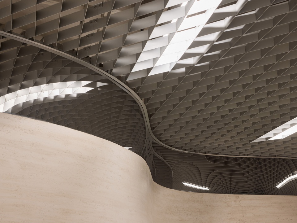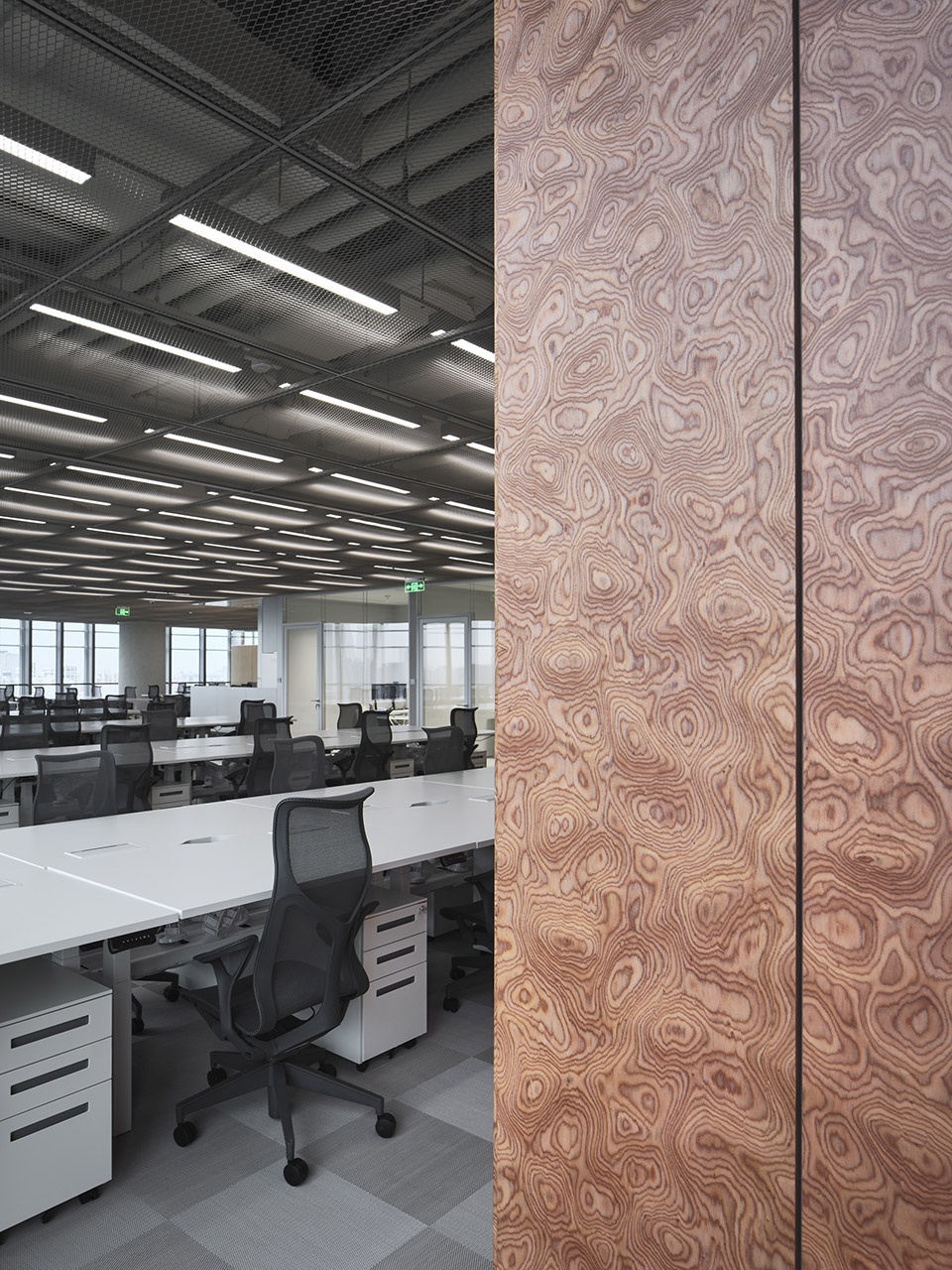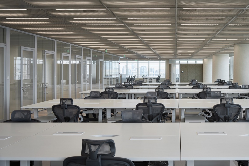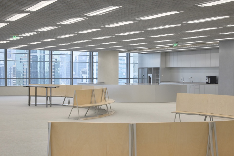 The design treats the ceiling and floor as the most homogeneous background, providing all the MEP and lighting. The ceiling features two types composition, metal mesh and aluminum grid, which allow for easy maintenance while ensuring visual continuity and unity. The work area adopts openable metal mesh and ultra-narrow slot diffuser, all in light gold. The public area is outfitted with a diamond-shaped perforated aluminum grid ceiling to improve acoustic and facilitate an even and warm lighting environment. The floor is covered with plain or woven PVC, with subtle variations in texture and color to define different zones.