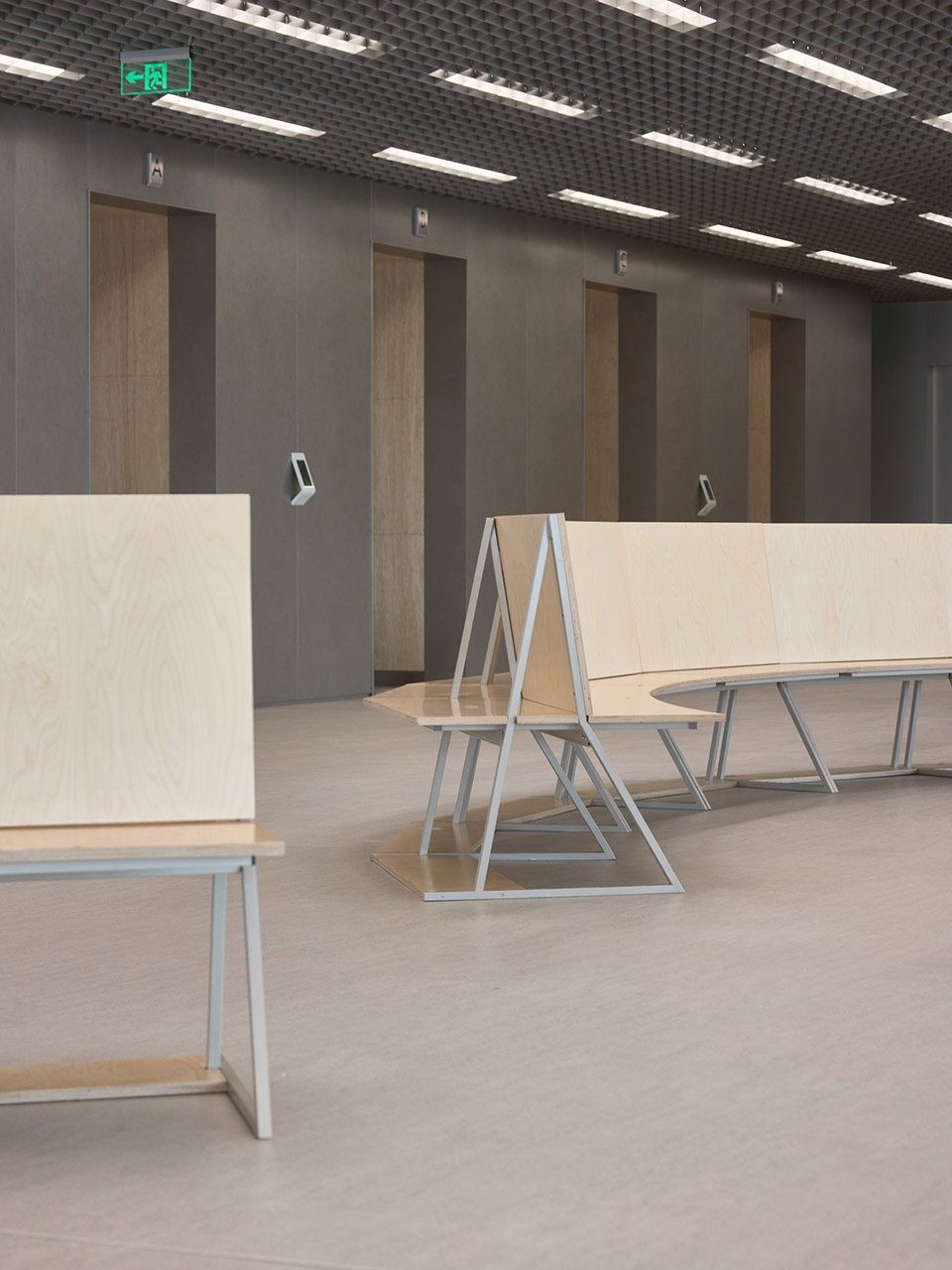 本次设计避免对复杂道具和灯具的运用。在公共区域只引入了三种简易家具:靠外窗的沙发座、弧形长凳+书架、弧形长桌。它们都用多层板制作,采用纤细的钢构件。它们可以结合空间内不同的活动(研讨会、日常午餐、临时展览、运动瑜伽)进行布局和腾挪。单元模块之间采用极其简易的插销链接,无需螺丝和工具、非常方便变换布局。