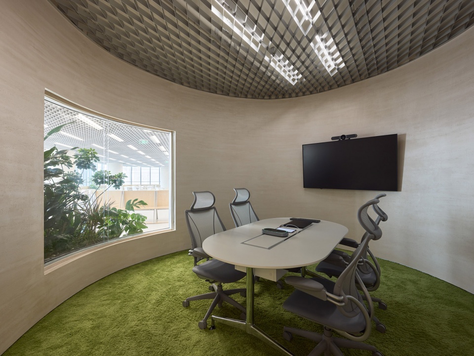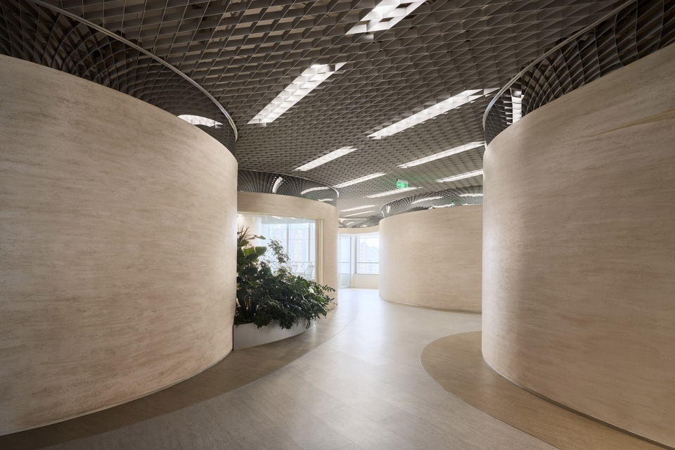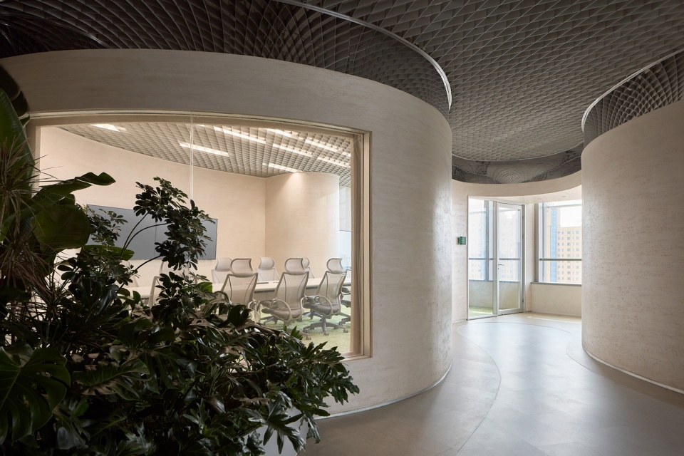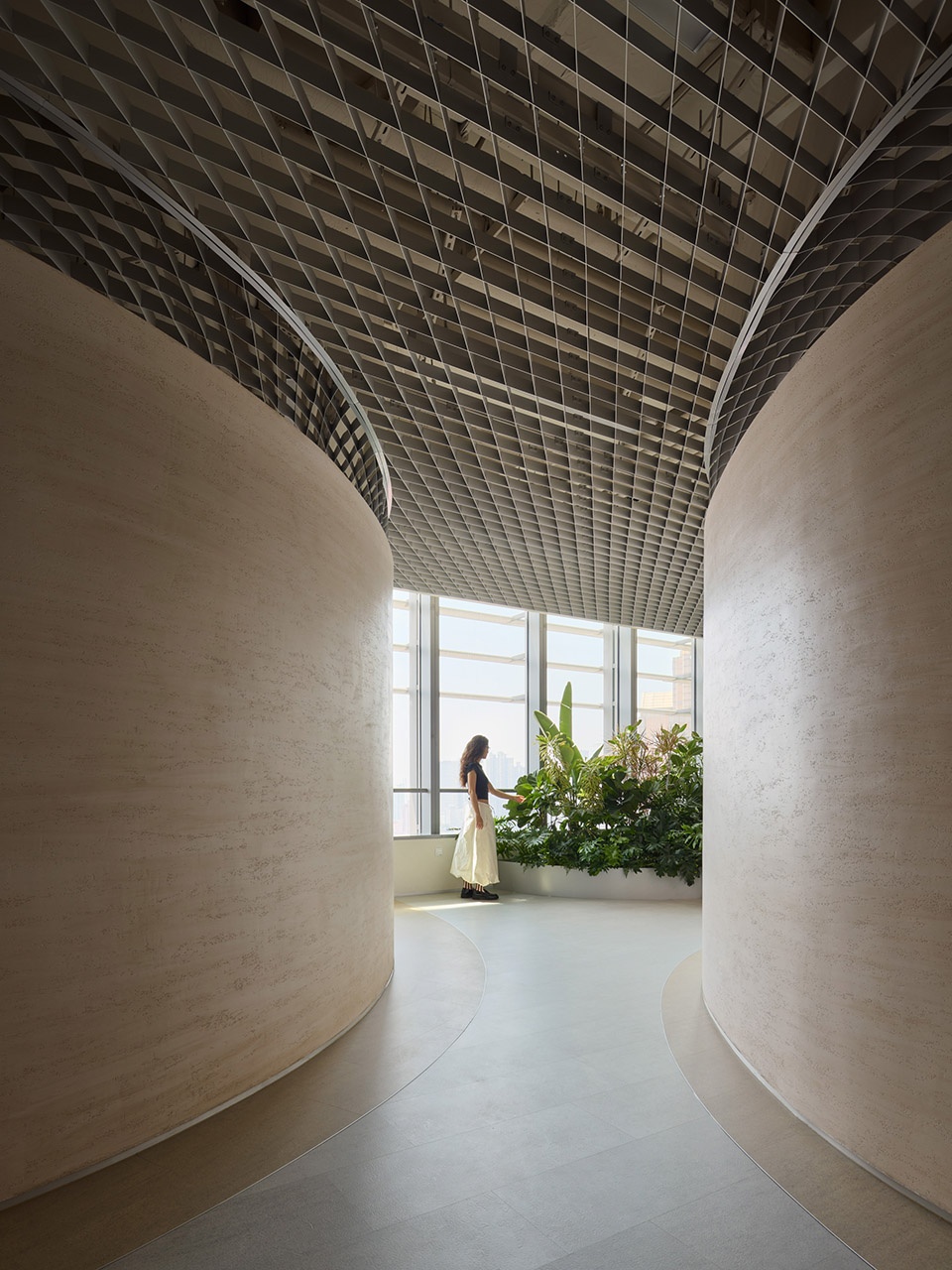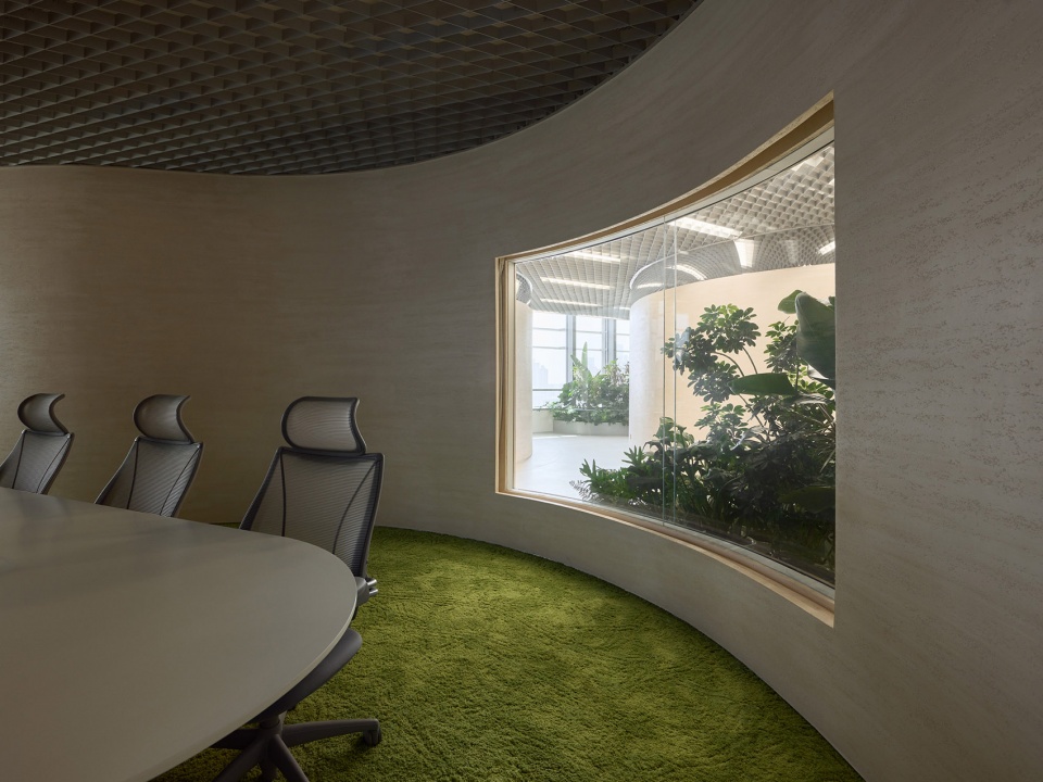 All phone booths, discussion rooms, and meeting rooms are conceived as infrastructure capsules floating on the uniform background. In the public area, oval-shape meeting rooms are compactly clustered together, forming a fluid, garden-like wall of scenery. The looking-through openings, cluster of greenery, rough travertine paint and mirrored stainless steel, all help to introduce a sense of breathing and flow to the highly privacy-focused artificial environment.