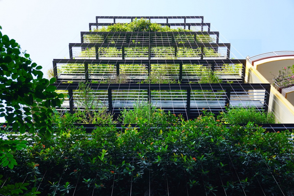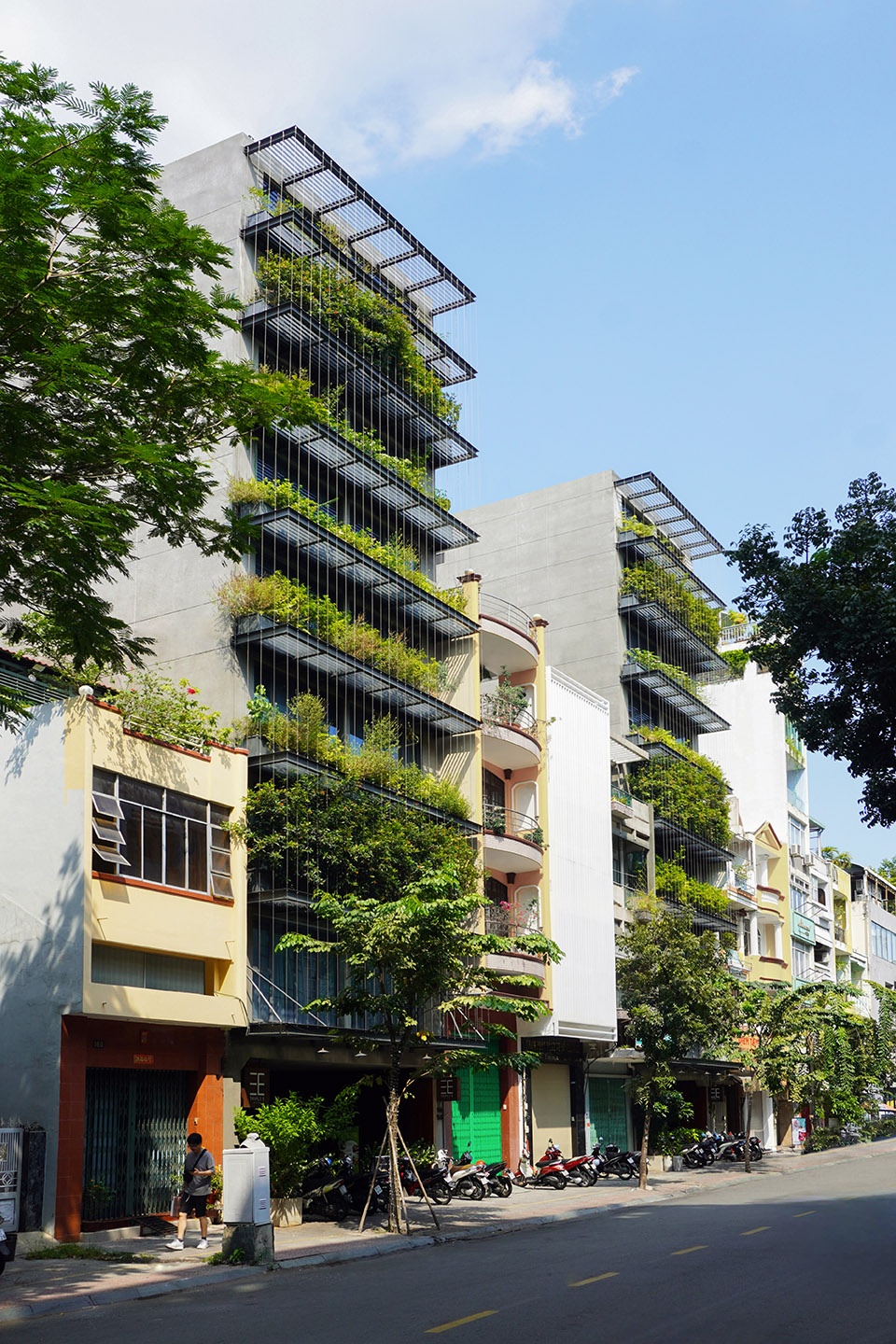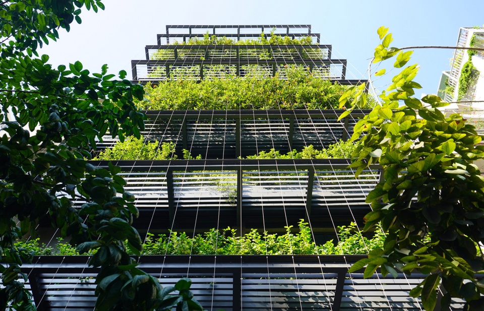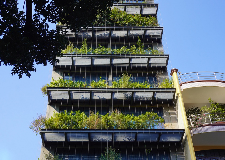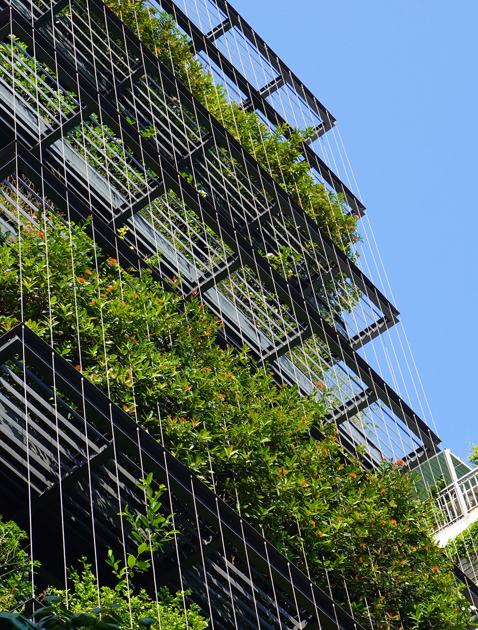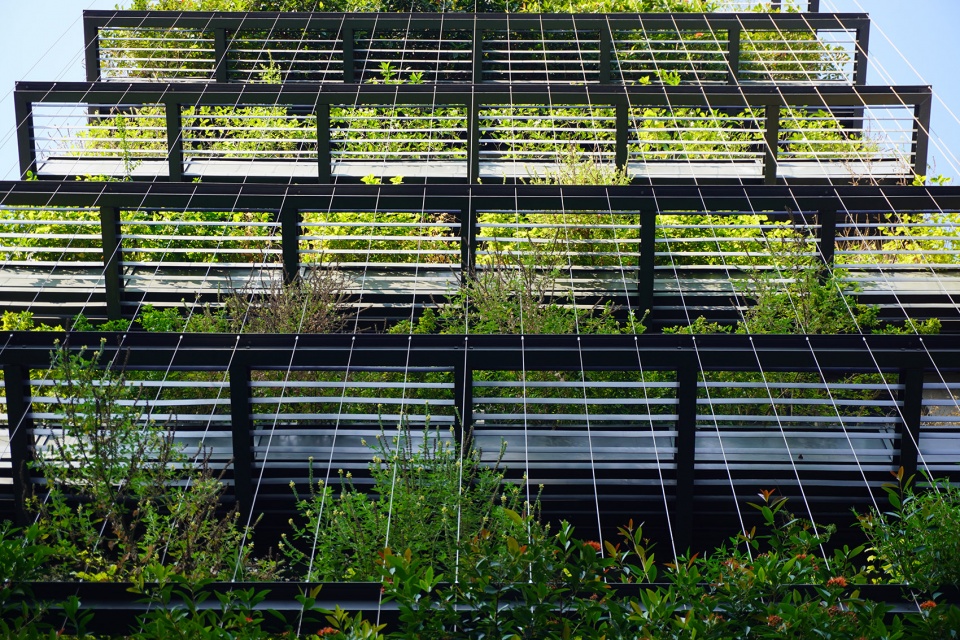 建筑立面被构想为一层“景观滤网”:由钢结构构成的框架系统支撑悬挂式植被,既作为面向西侧的遮阳装置,也为内部空间提供一层绿意盎然的视觉缓冲。植物、钢缆与框架之间的交织关系形成了一种通透的热带立面肌理——低调却富有表现力,在密集的城市环境中呈现出克制而鲜明的美学存在。