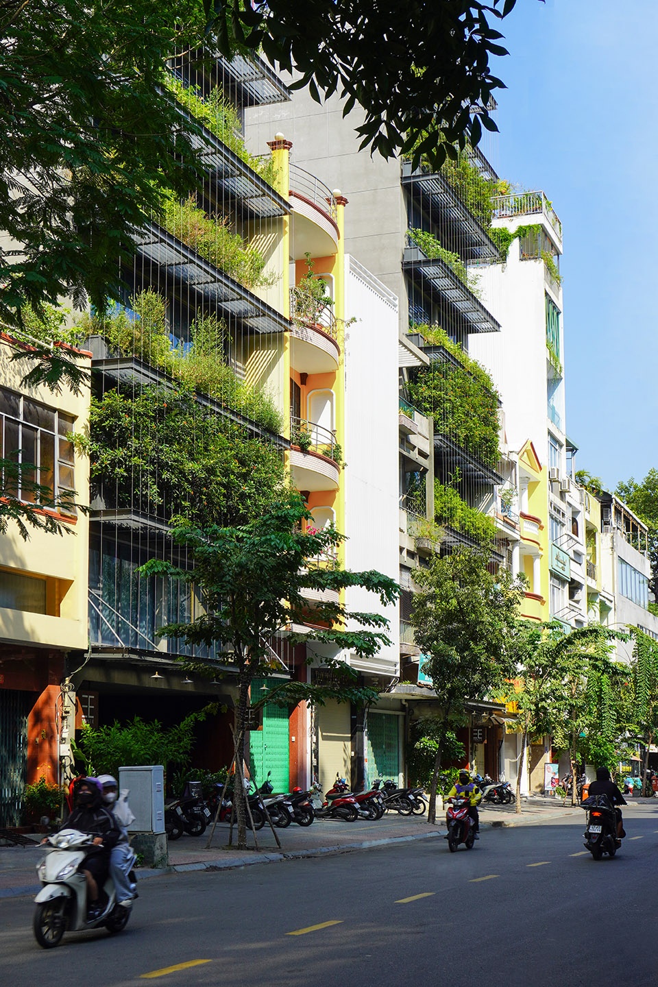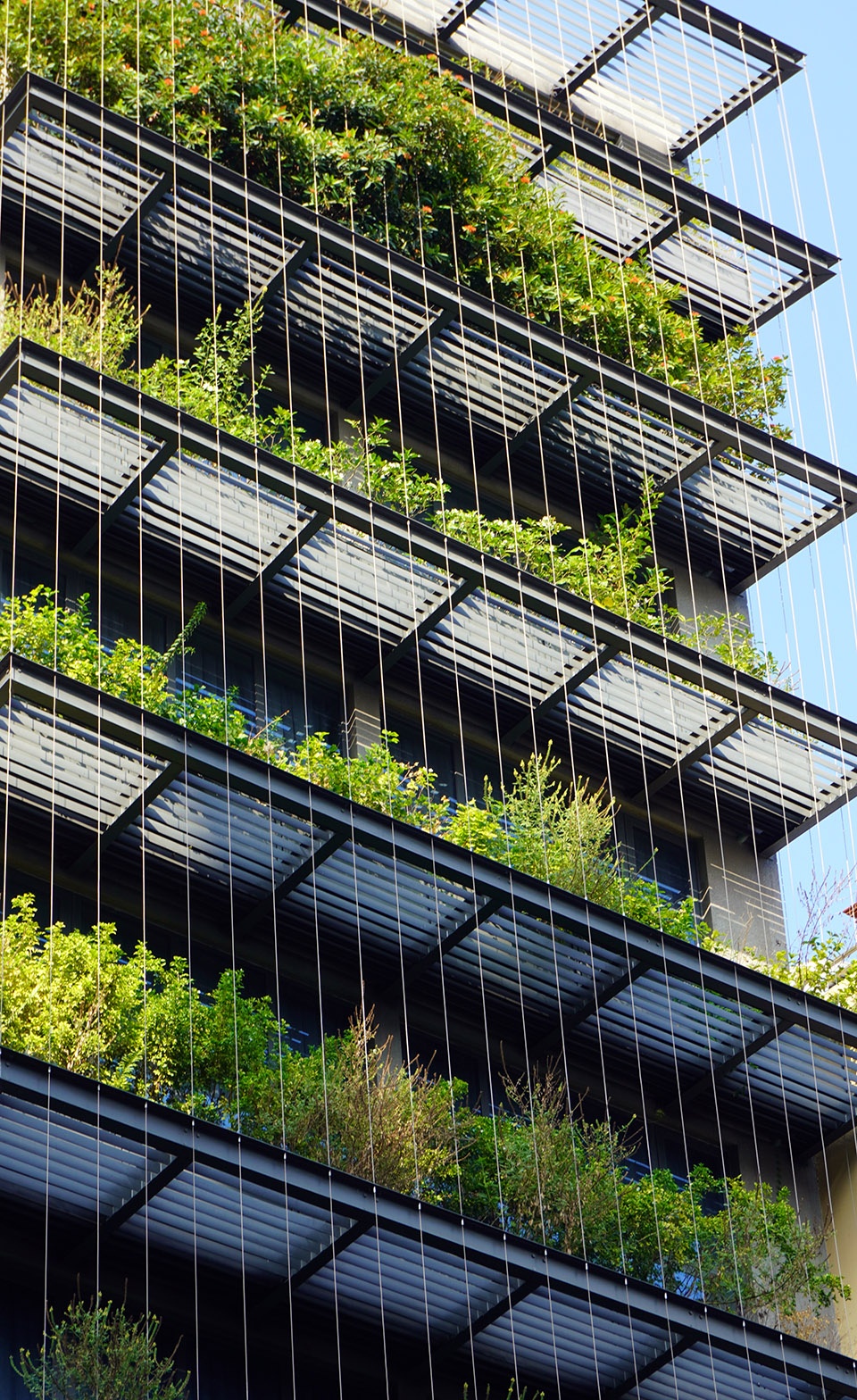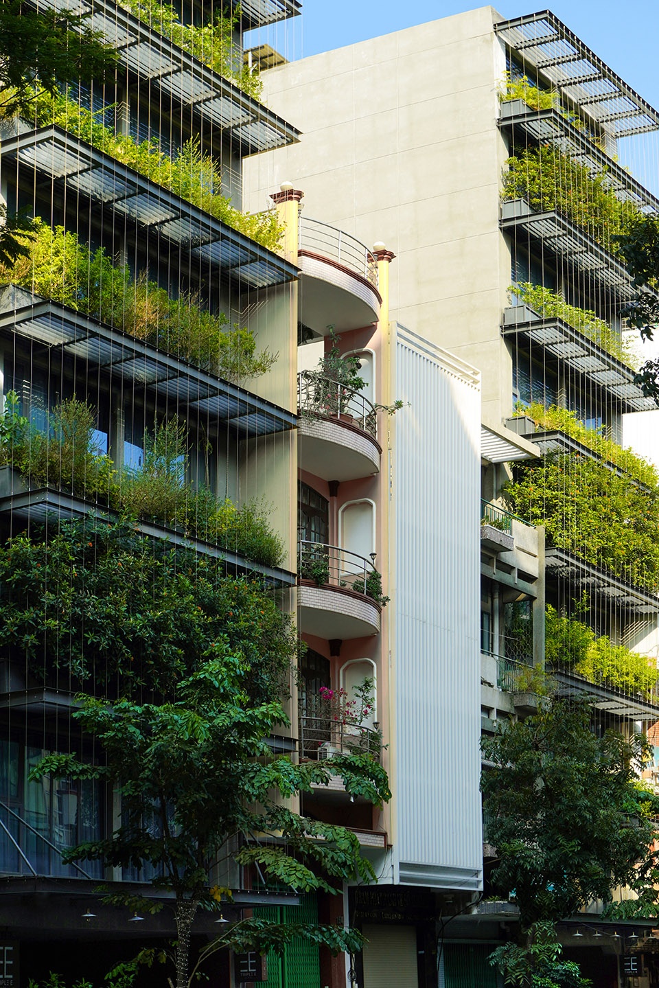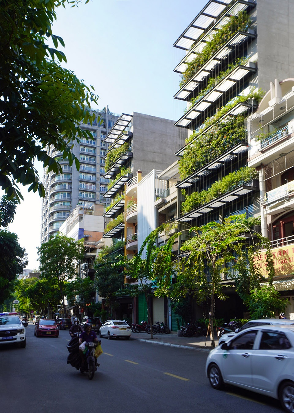 建筑立面被构想为一层“景观滤网”:由钢结构构成的框架系统支撑悬挂式植被,既作为面向西侧的遮阳装置,也为内部空间提供一层绿意盎然的视觉缓冲。植物、钢缆与框架之间的交织关系形成了一种通透的热带立面肌理——低调却富有表现力,在密集的城市环境中呈现出克制而鲜明的美学存在。