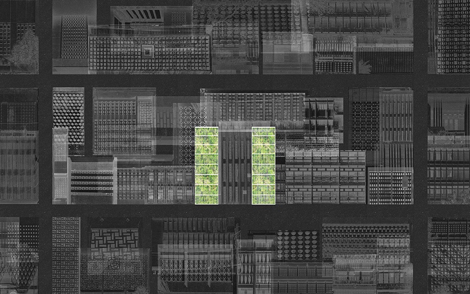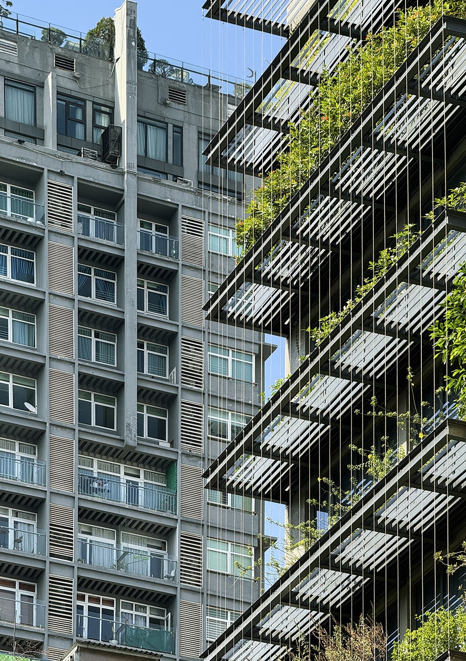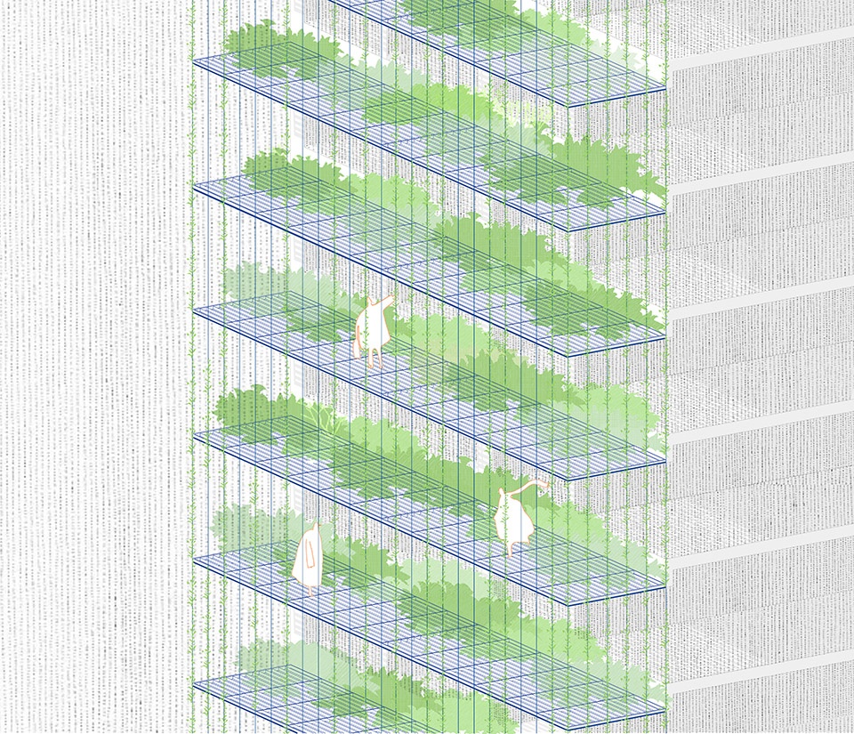 The building façade is conceived as a “green filter”: a steel framework supporting hanging vegetation, serving both as a west-facing sunshade and a green visual buffer for the interior spaces. The interplay of plants, steel cables, and frame creates a porous tropical mass—subtle yet expressive—offering a modest aesthetic presence within the dense urban fabric.