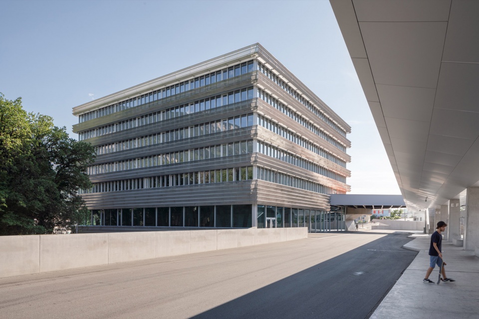 The ground floor houses public programs, including the cafeteria and two lecture halls shared with the HES-SO, which also occupies the upper level.
