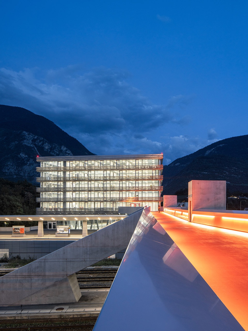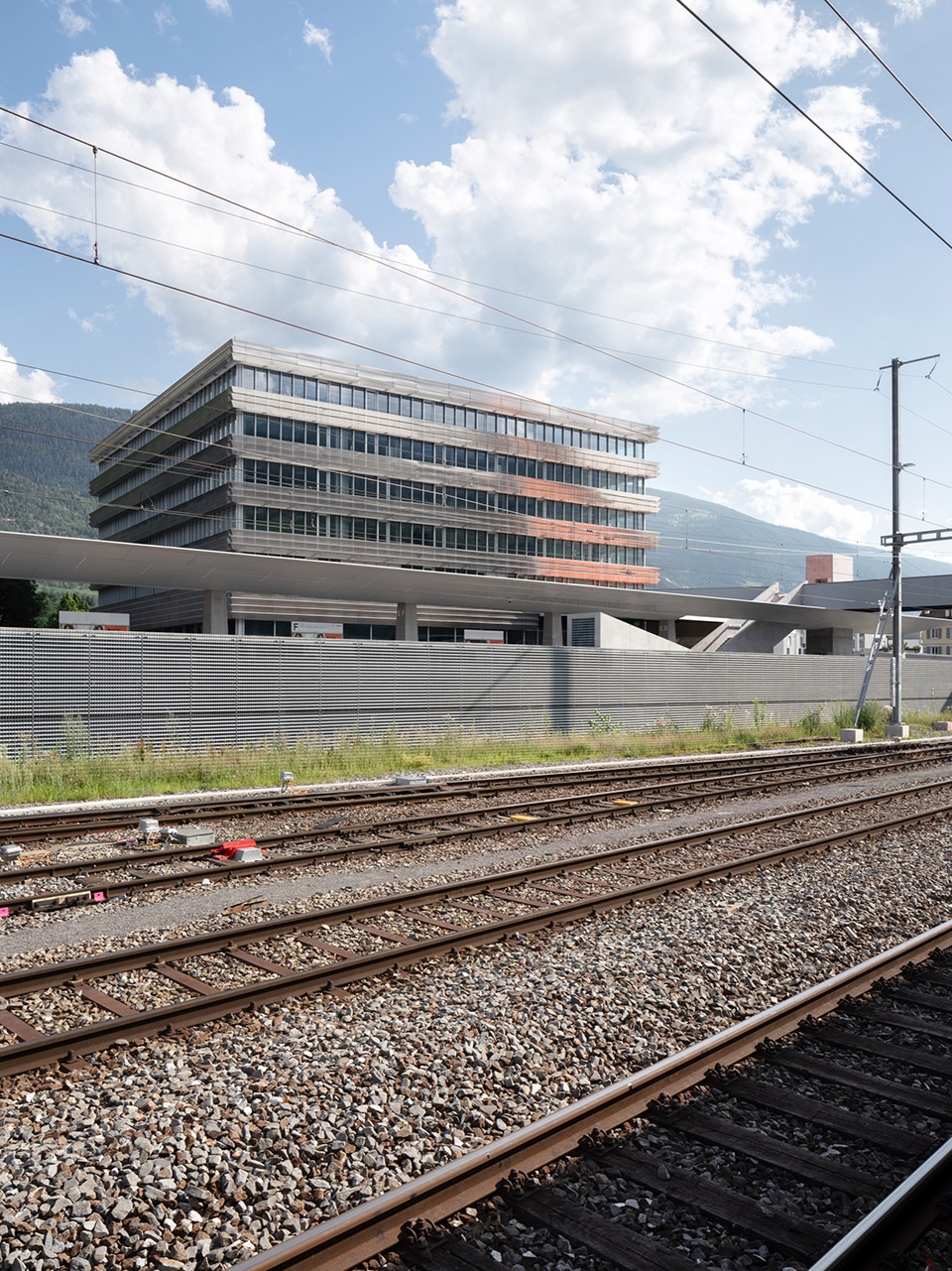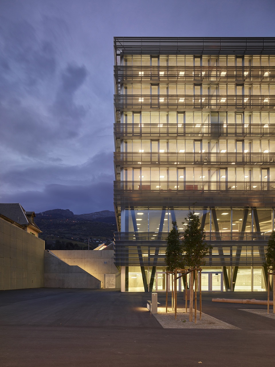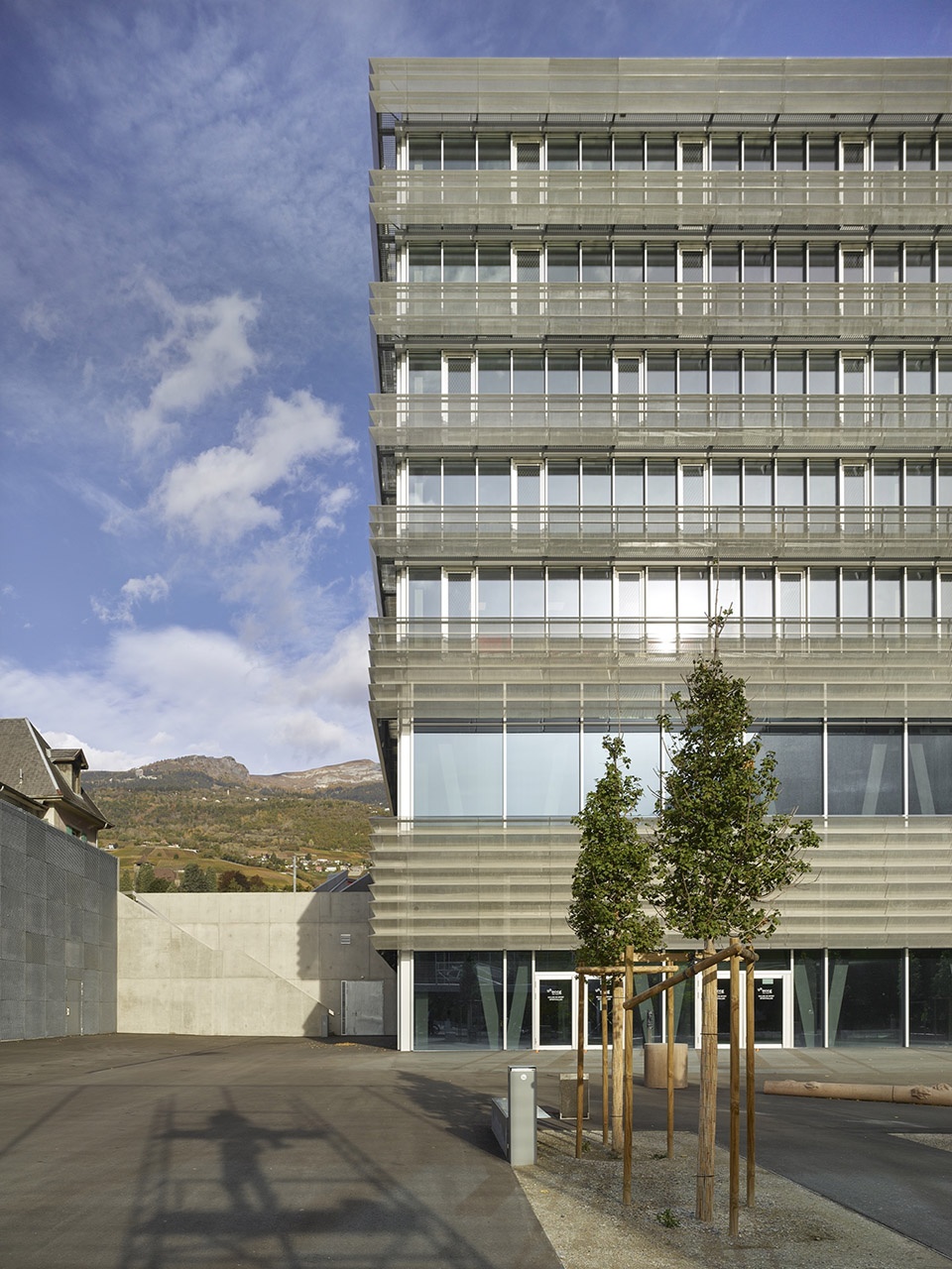 The new business and general education school is located south of the SBB railway tracks, marking—alongside the mobility infrastructure—the expansion of the city of Sierre beyond the rail line. The Bellevue plain now features a second educational facility, following the School of Social Work.